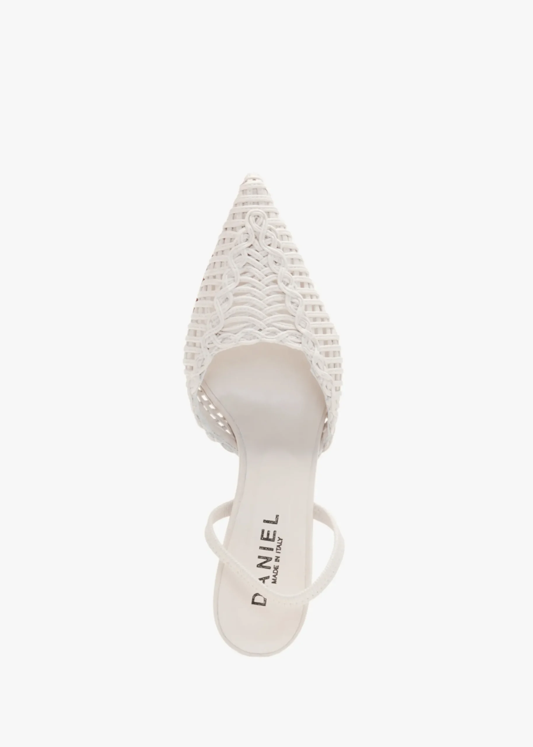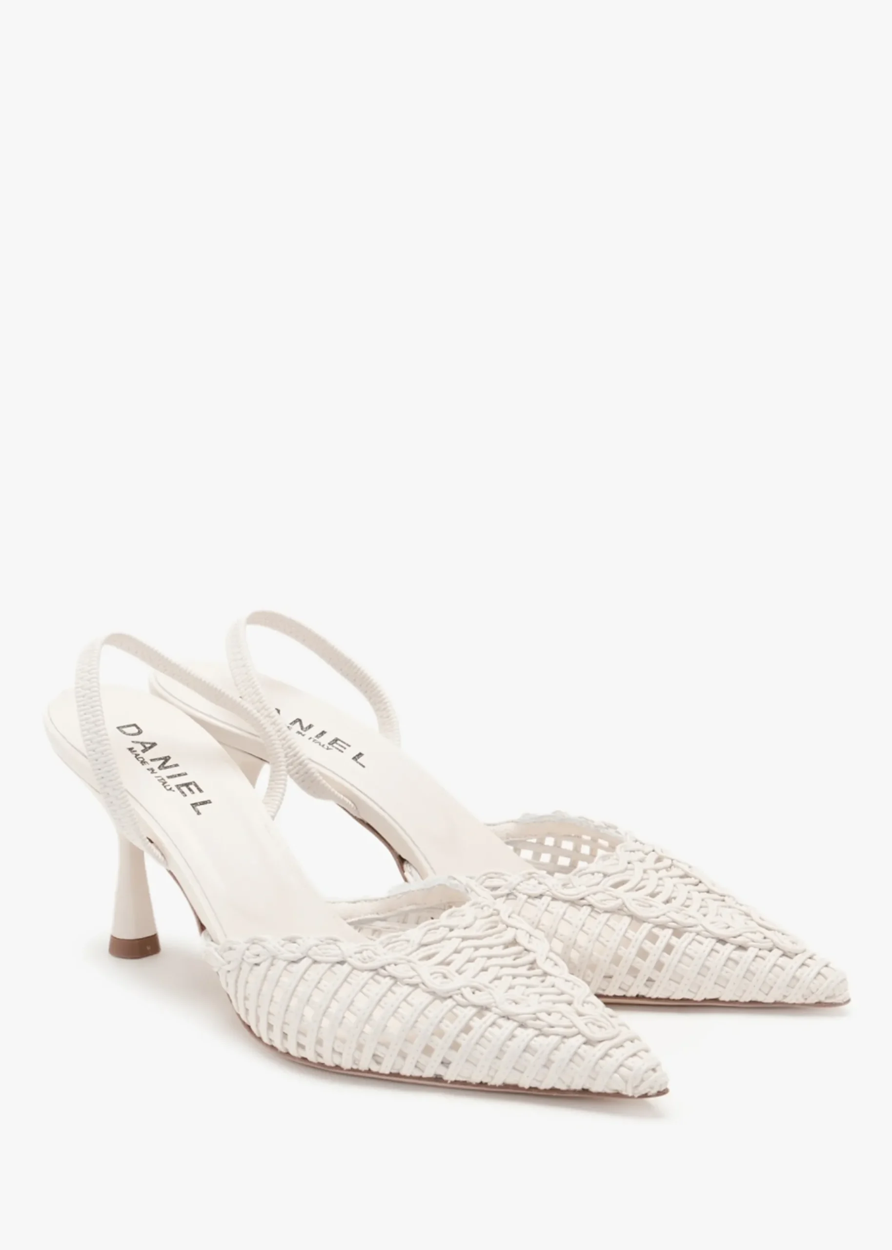 The ‘Tiffi Low’ sling back heeled court shoes from Daniel Footwear elegantly frames the foot. A must have style that will take you from day to dark seamlessly. Crafted from a premium leather upper in a chic woven design with luxurious leather lining and sole. An easy to wear slip on style featuring elasticated sling back. The classic pointed toe and shaped mid heel make up the silhouette. Signature Daniel branding is seen to the foot-bed. These bestselling heels can by styled with practically anything.