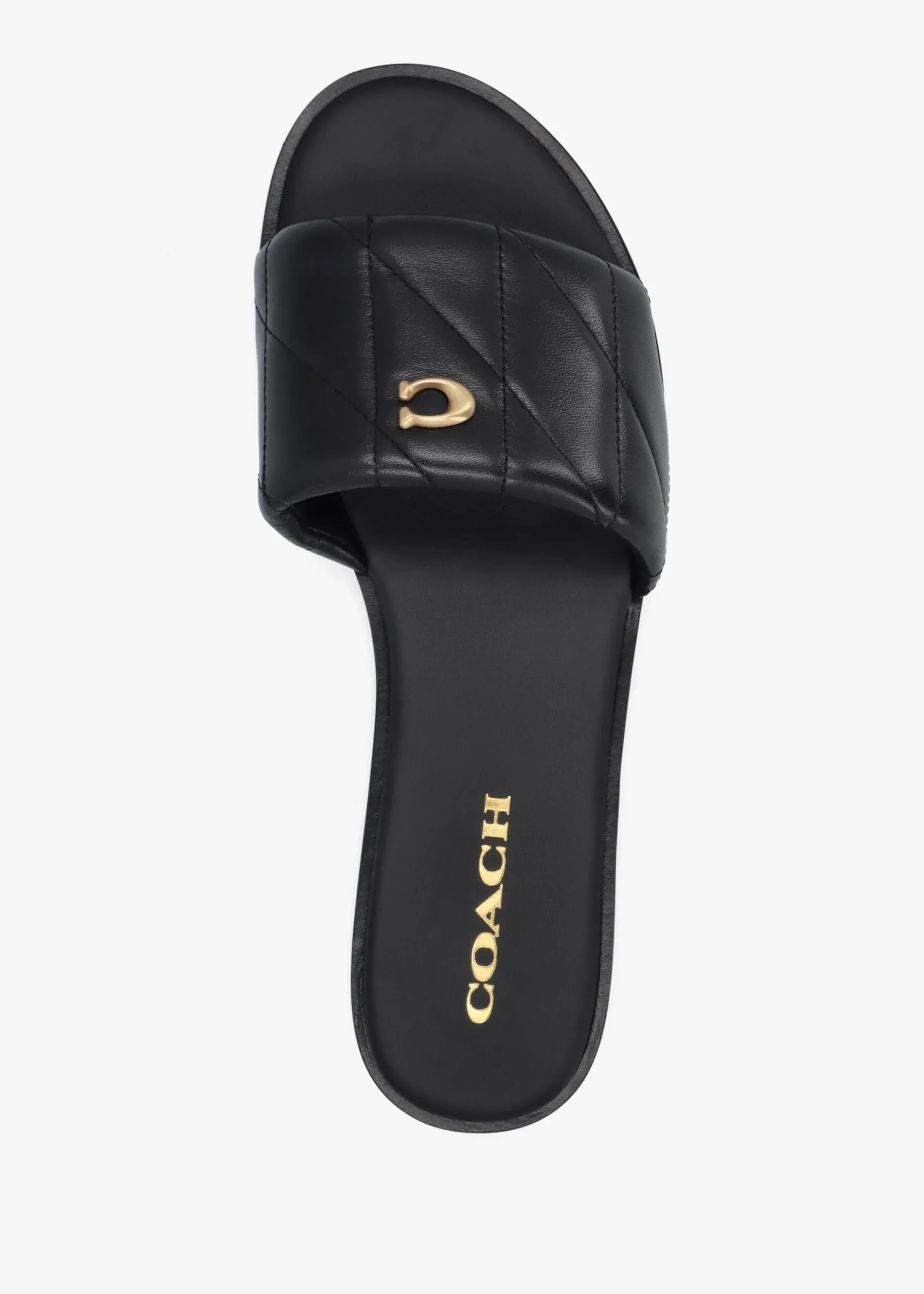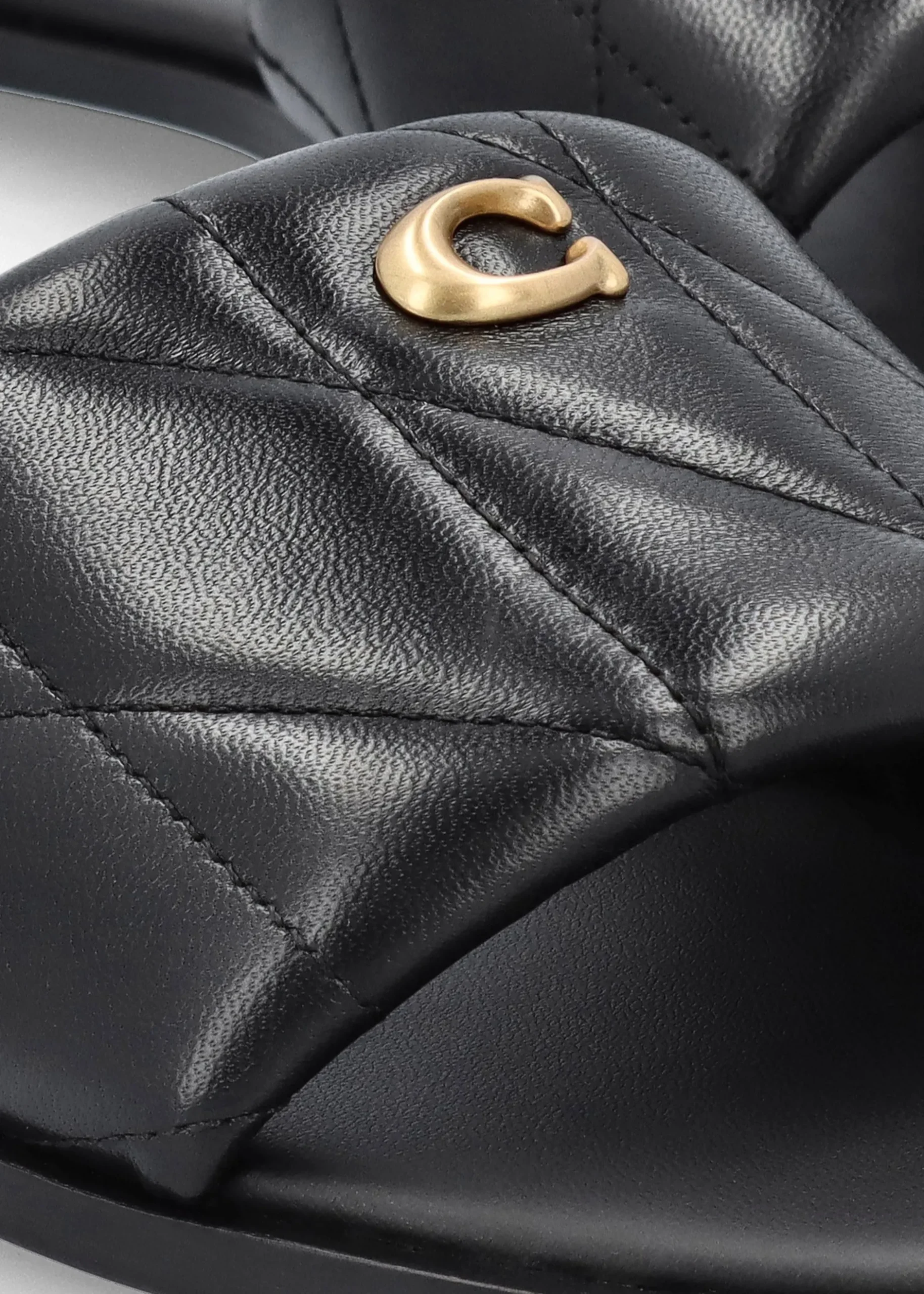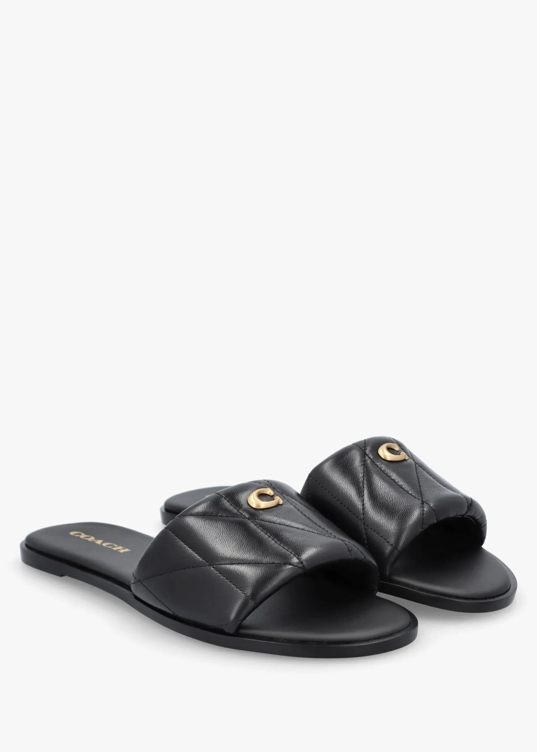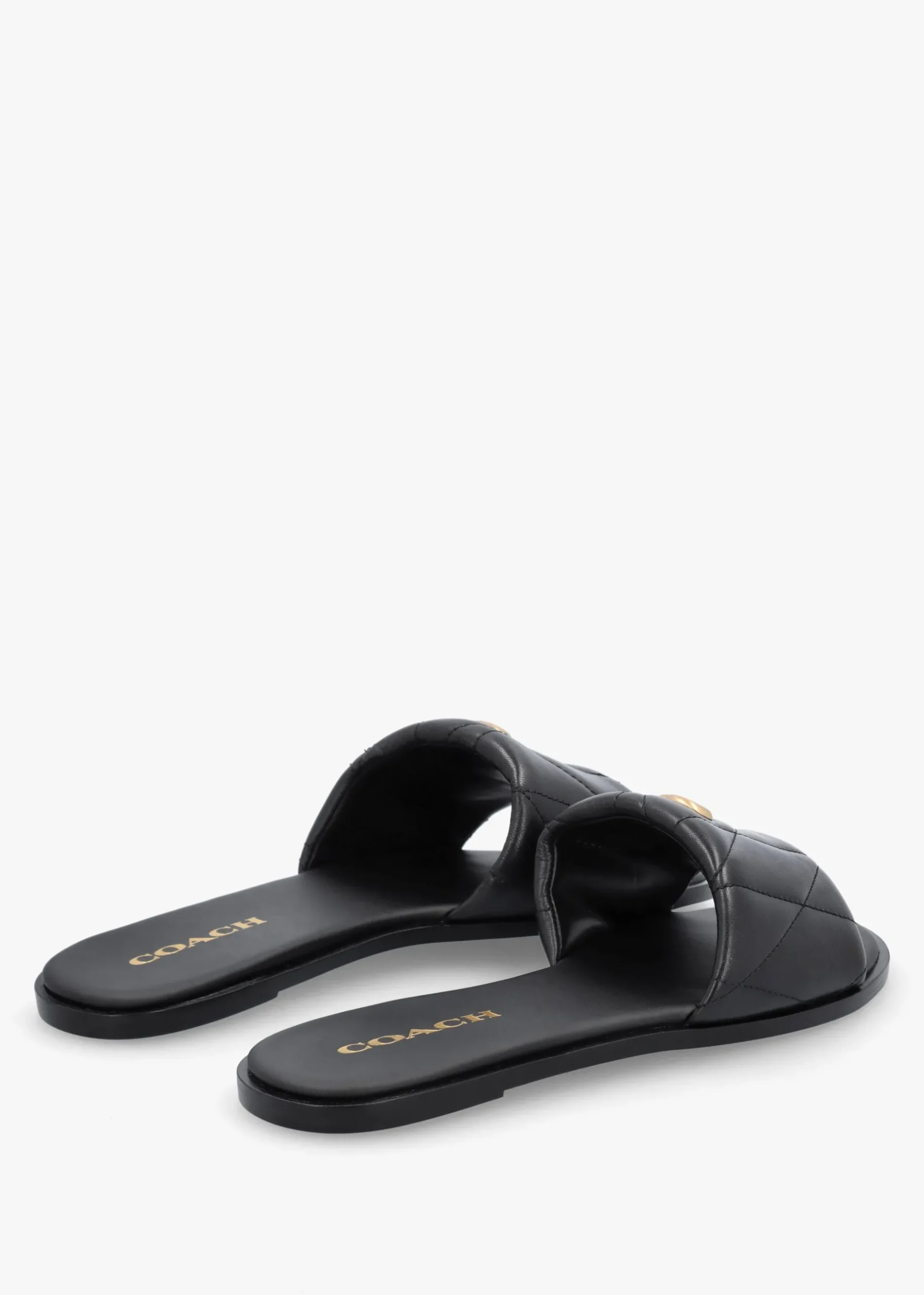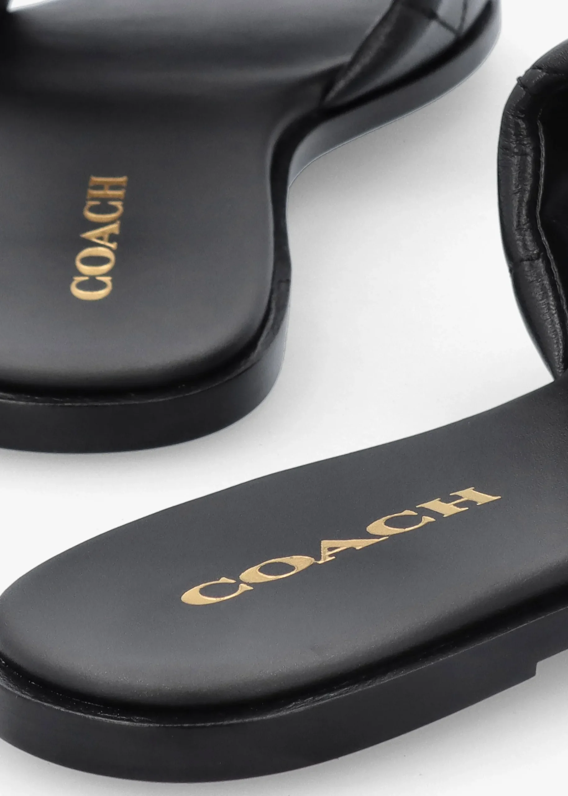 New for the Summer Season from COACH the ‘Holly Quilted’ flat mules. This everyday style is crafted from a premium leather upper in a classic quilted design with PU lining, padded footbed and a lightweight rubber sole. An easy to wear slip on style. Brass tone C logo adds detail to the upper. Signature COACH branding is seen to the footbed and sole.