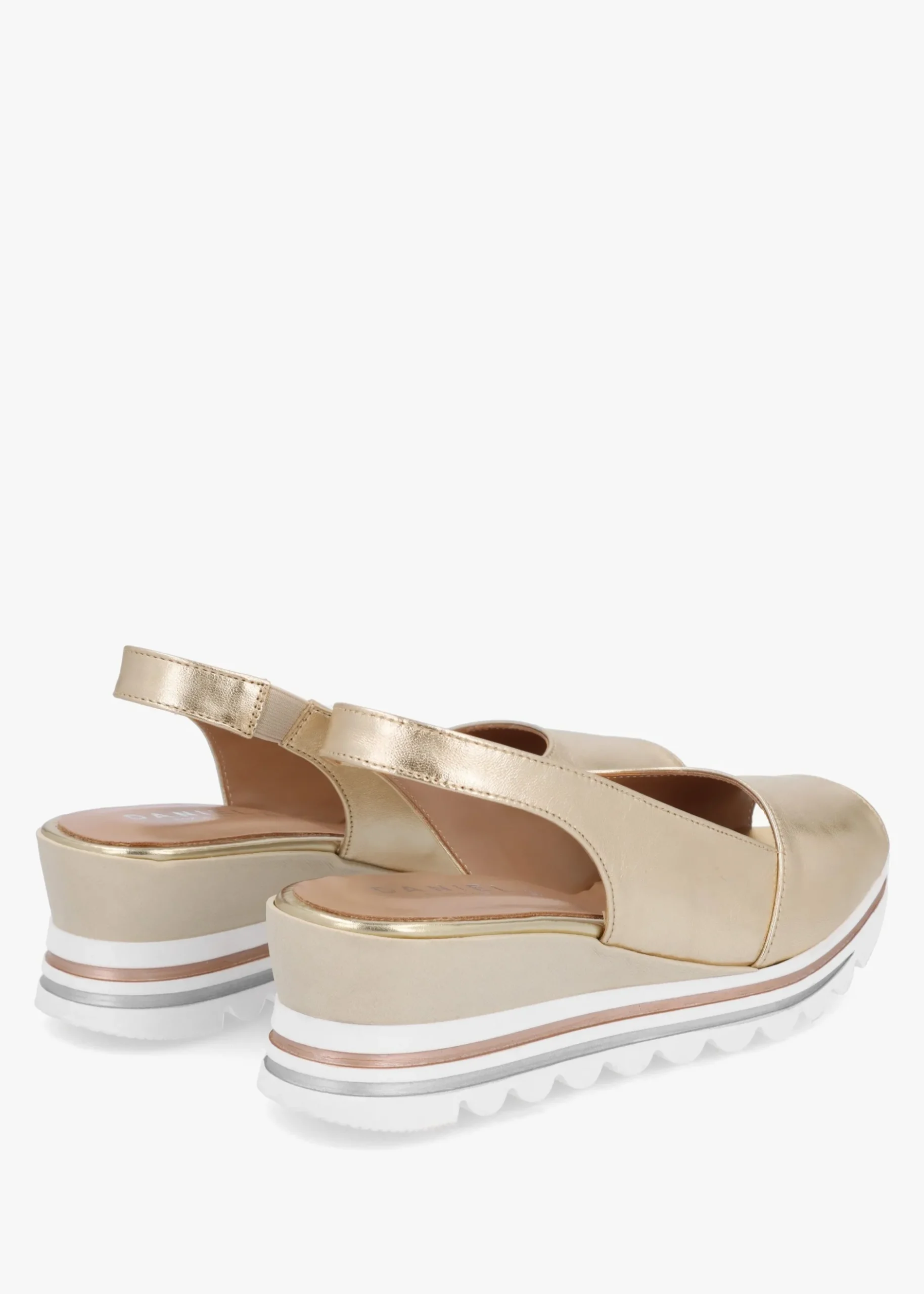 The ‘Canna’ wedge sandals are part of the New Season collection from Daniel Footwear. This classic style is crafted from a premium metallic leather upper with luxurious leather lining and a striped chunky cleated rubber sole. The cushioned foot-bed sock, new to the Daniel collection this Season creates add comfort for all day wear. Classic peep toe and mid wedge heel make up the silhouette. An easy to wear slip on style featuring elasticated sling back. Signature Daniel branding is seen to the foot-bed.