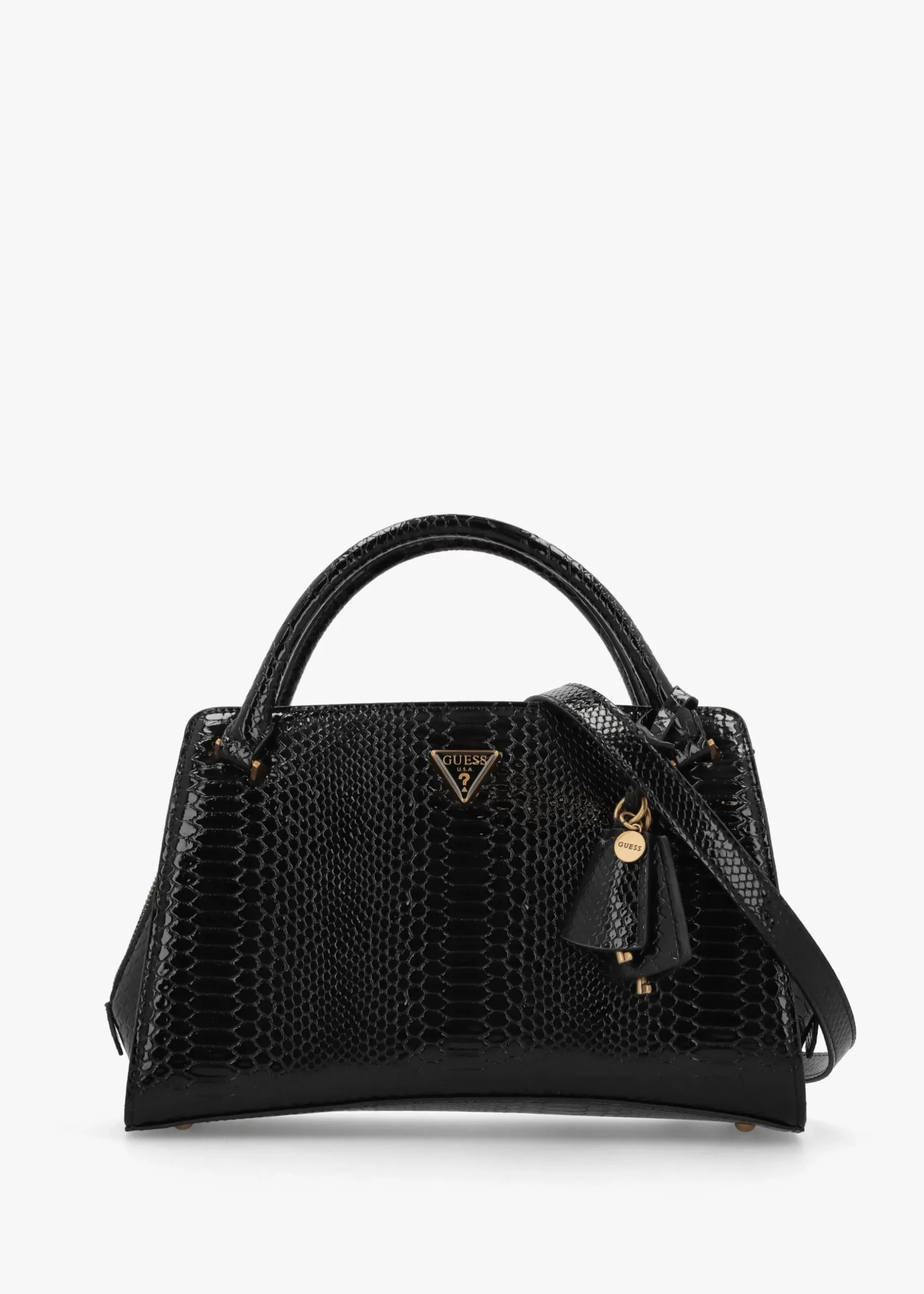 New to Daniel Footwear this Season ‘Annita Girlfriend’ satchel from GUESS. This vintage inspired style is crafted from premium PU in a chic reptile design with gold tone accents. Triple compartments feature with logo lining, central zip pocket and handy inner zip and slot pockets, further zip pocket is seen to the exterior. Carry by the grab handles or the detachable strap. Double luggage tag adds detail as well as classic triangle logo motif. Signature GUESS branding is seen throughout.