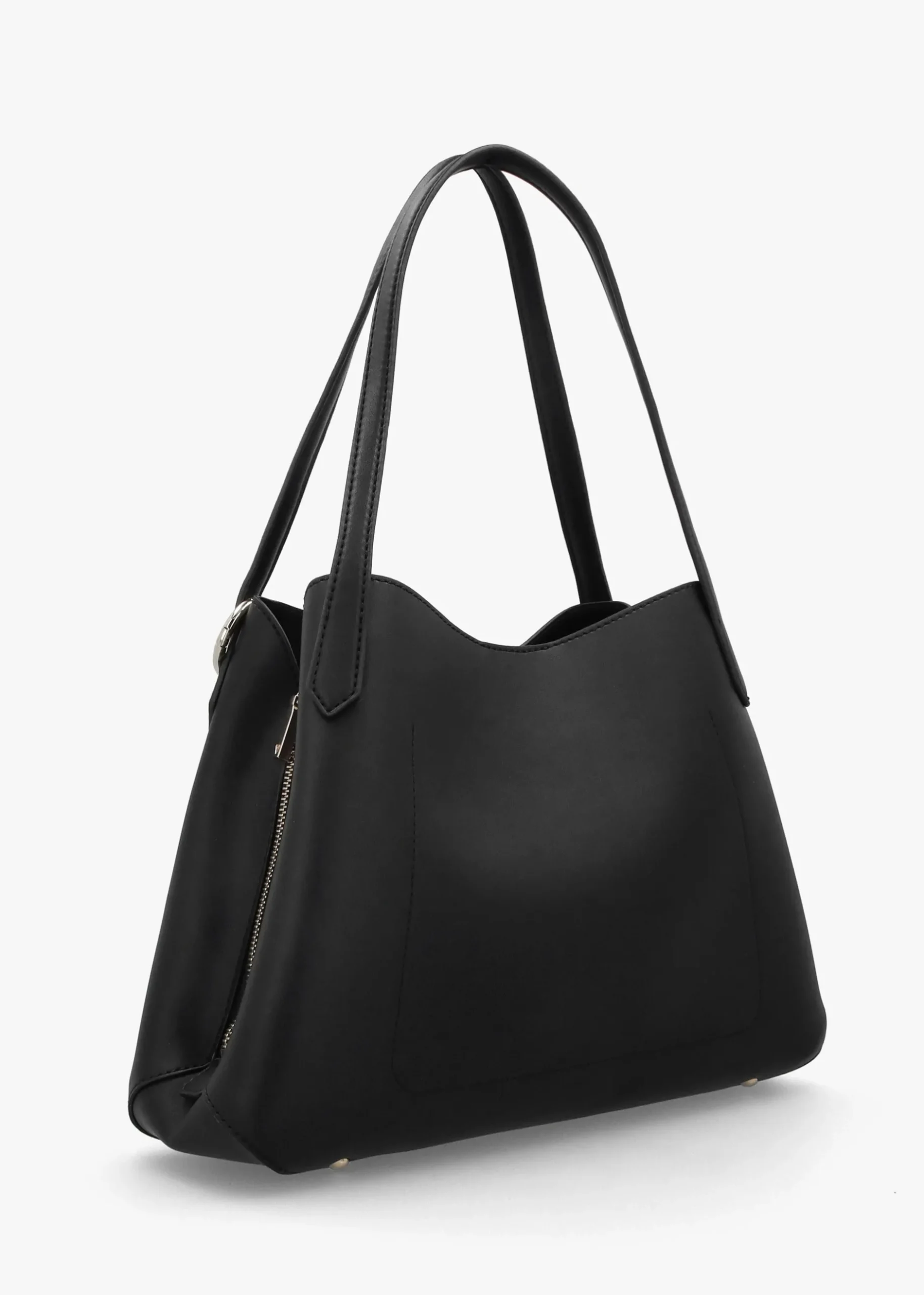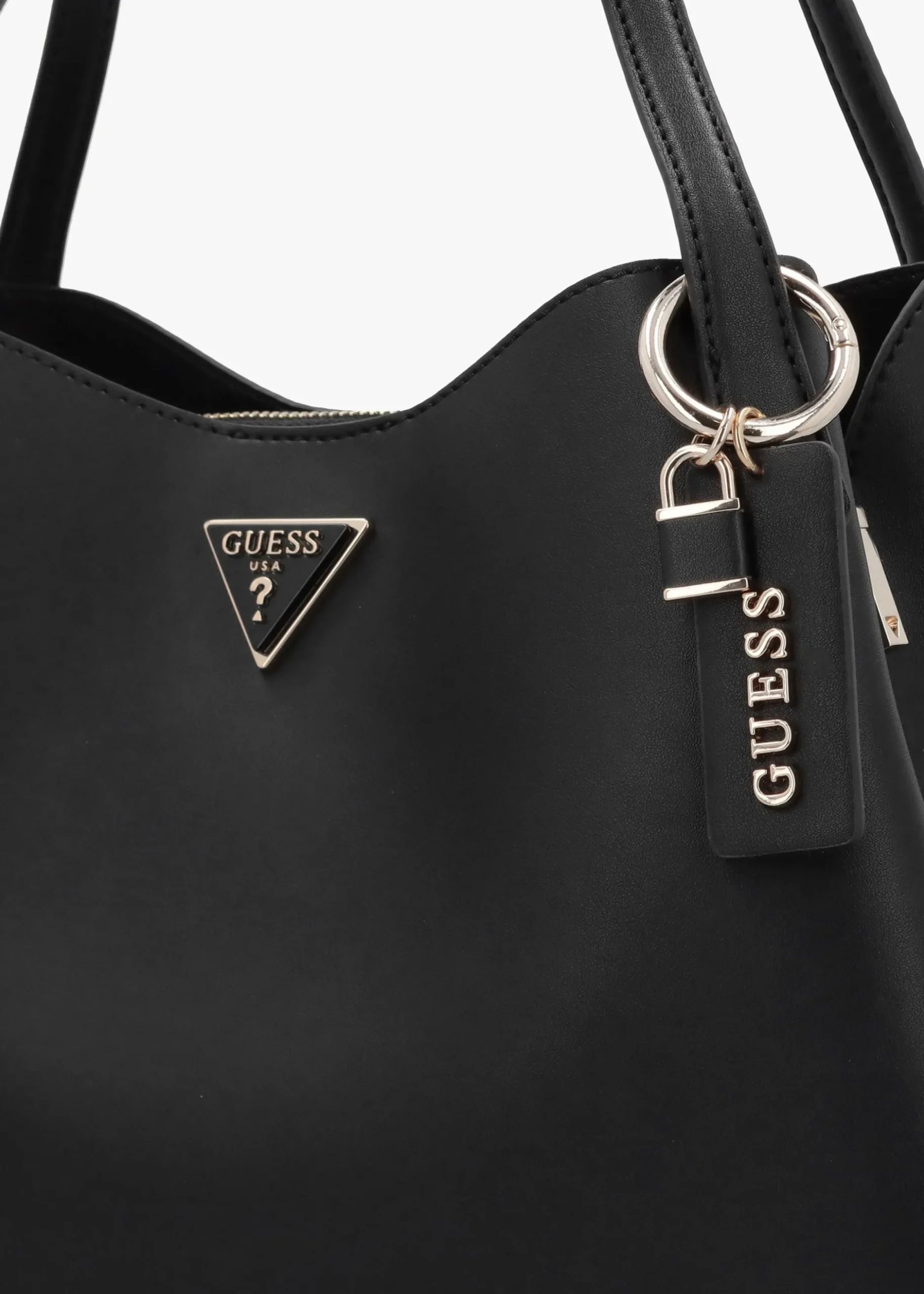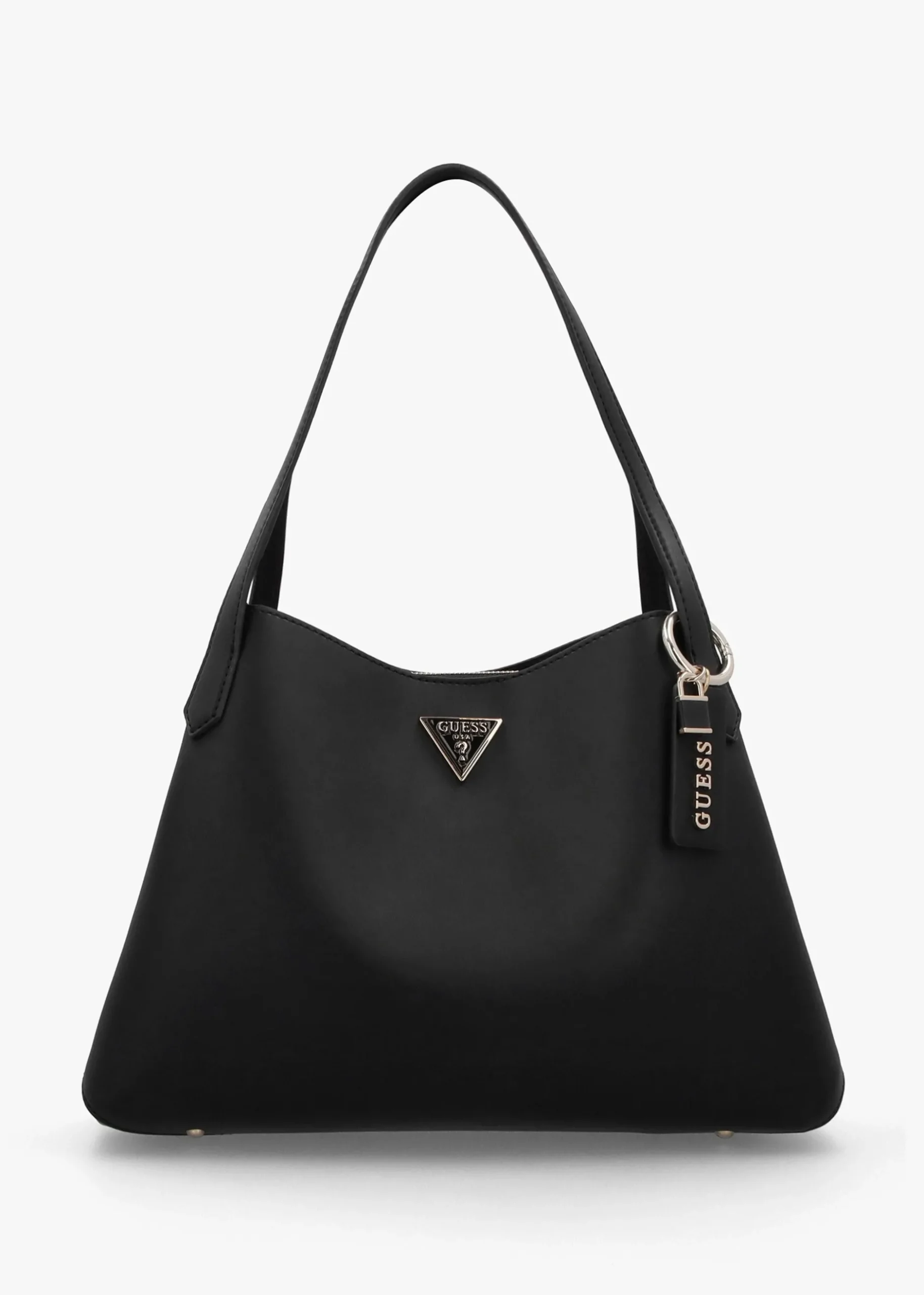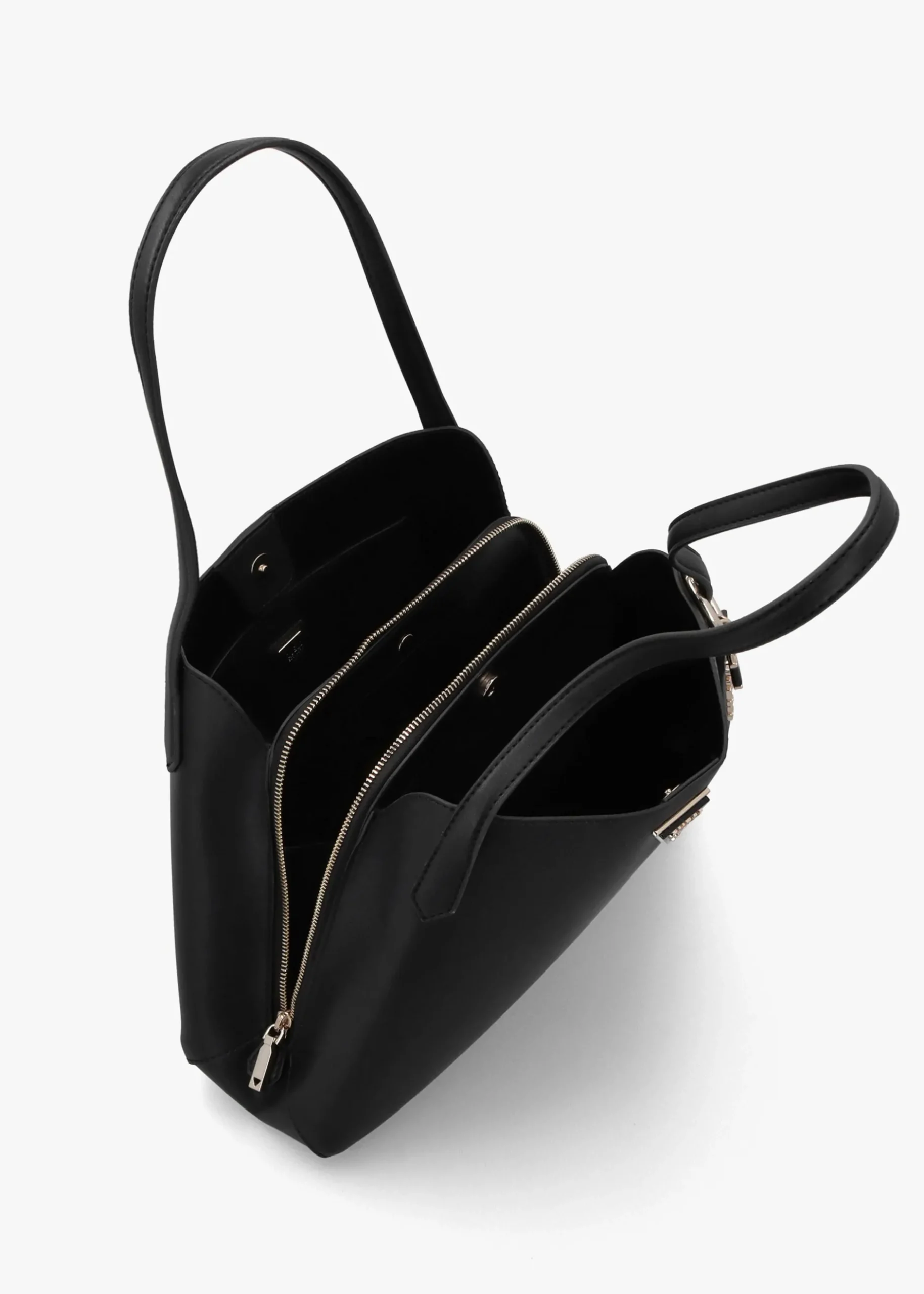 The large ‘Sora Girlfriend Carryall’ bag is part of the New Season collection from GUESS. Crafted from premium smooth PU with polished gold tone accents. The secure magnetic snap fastening reveals triple compartments including a central large zipper pocket and handy inner slip pocket. Carry by the top handles. Classic triangle logo motif adds detail. Signature GUESS branding is seen throughout.