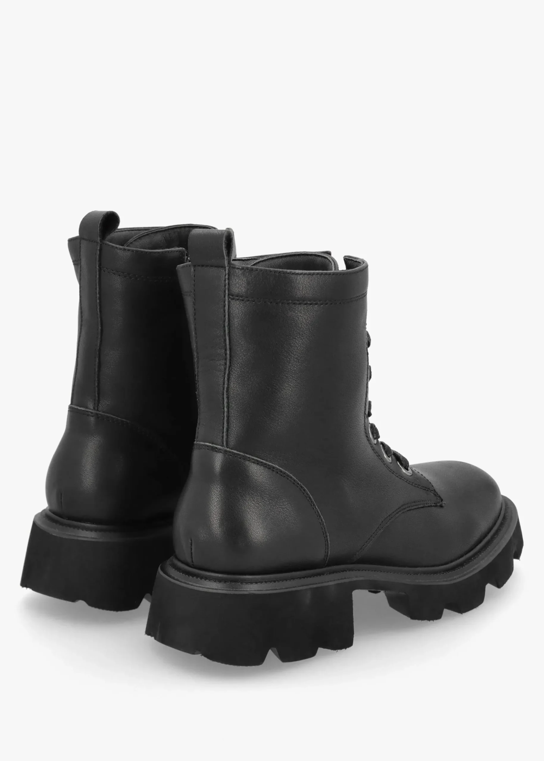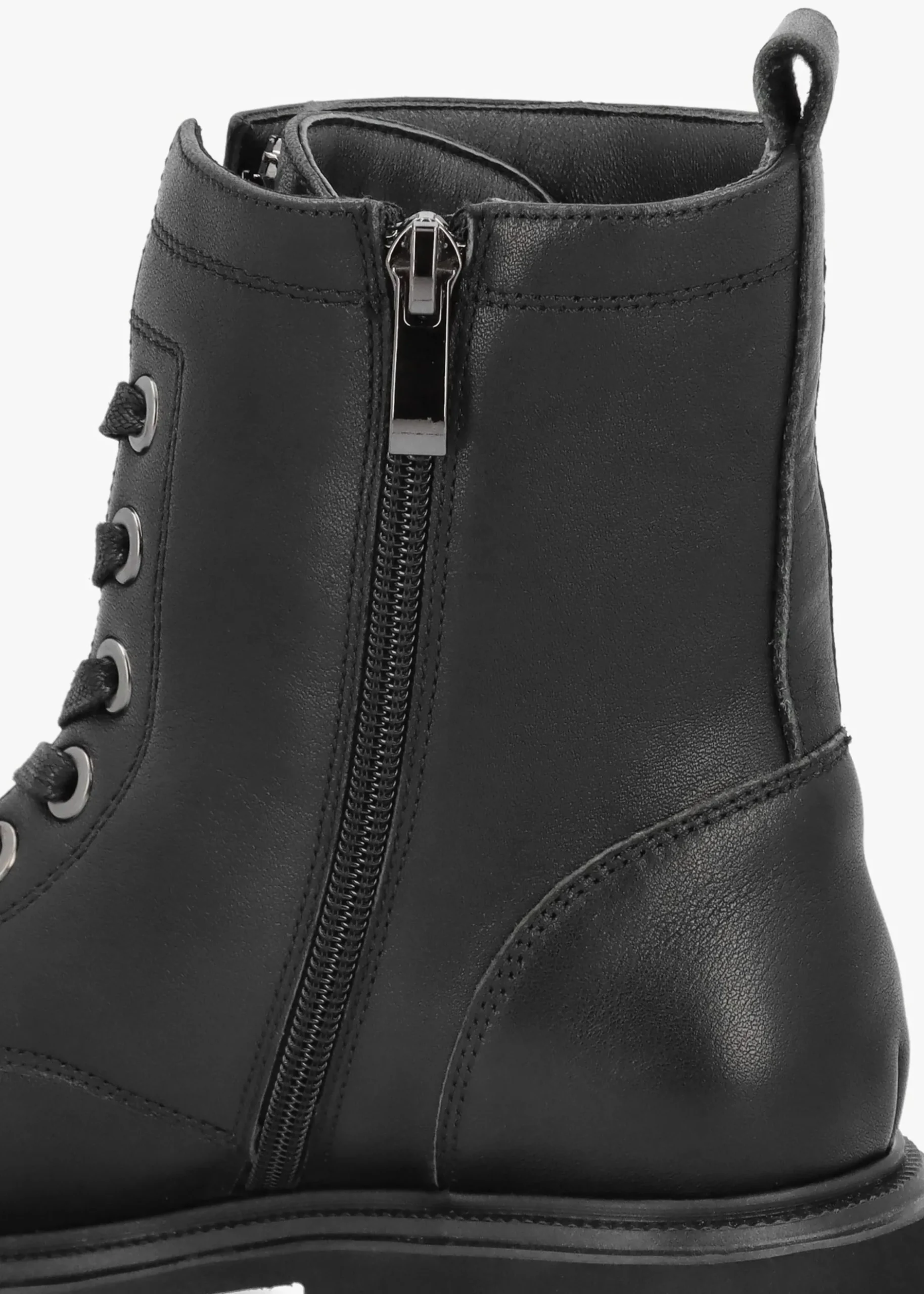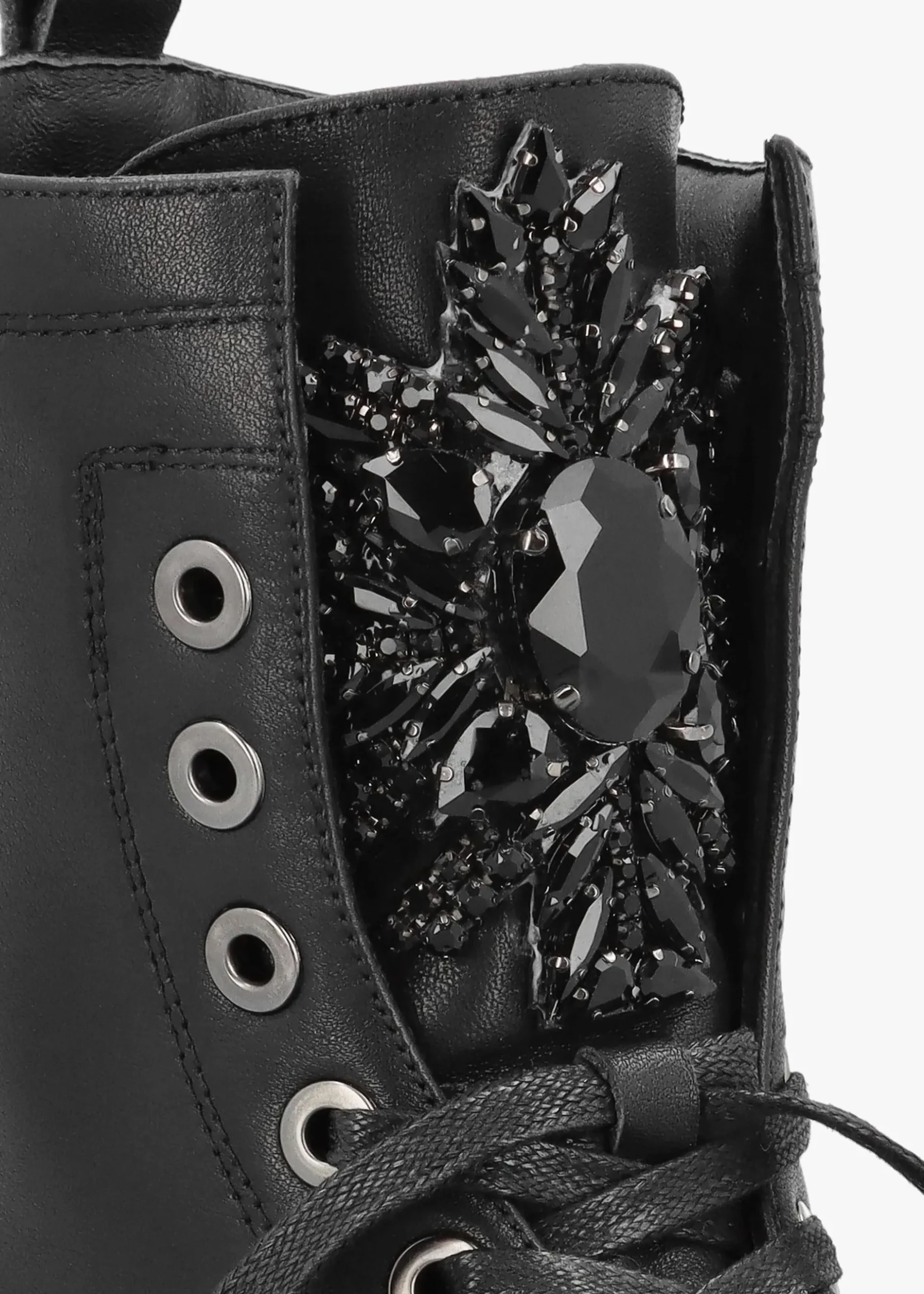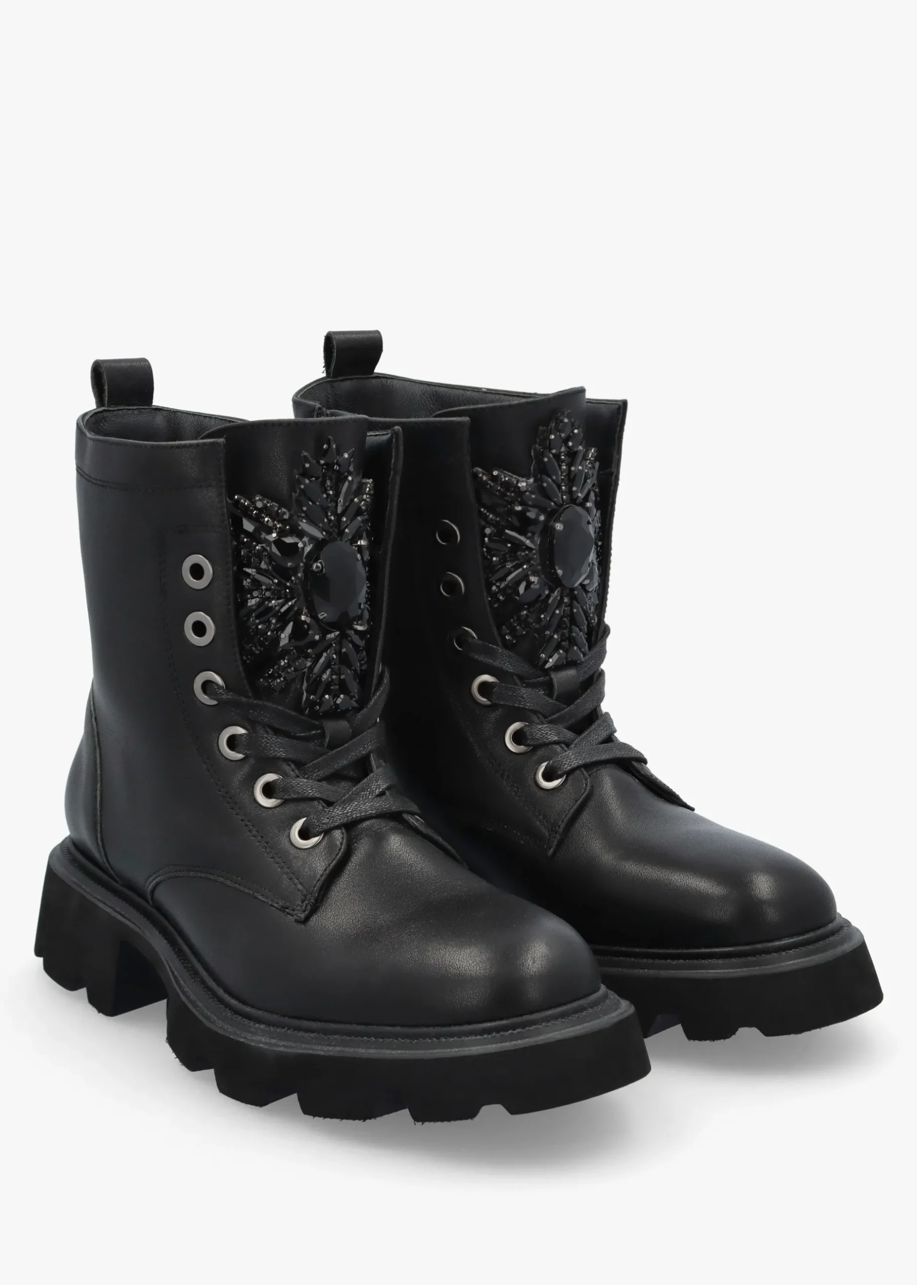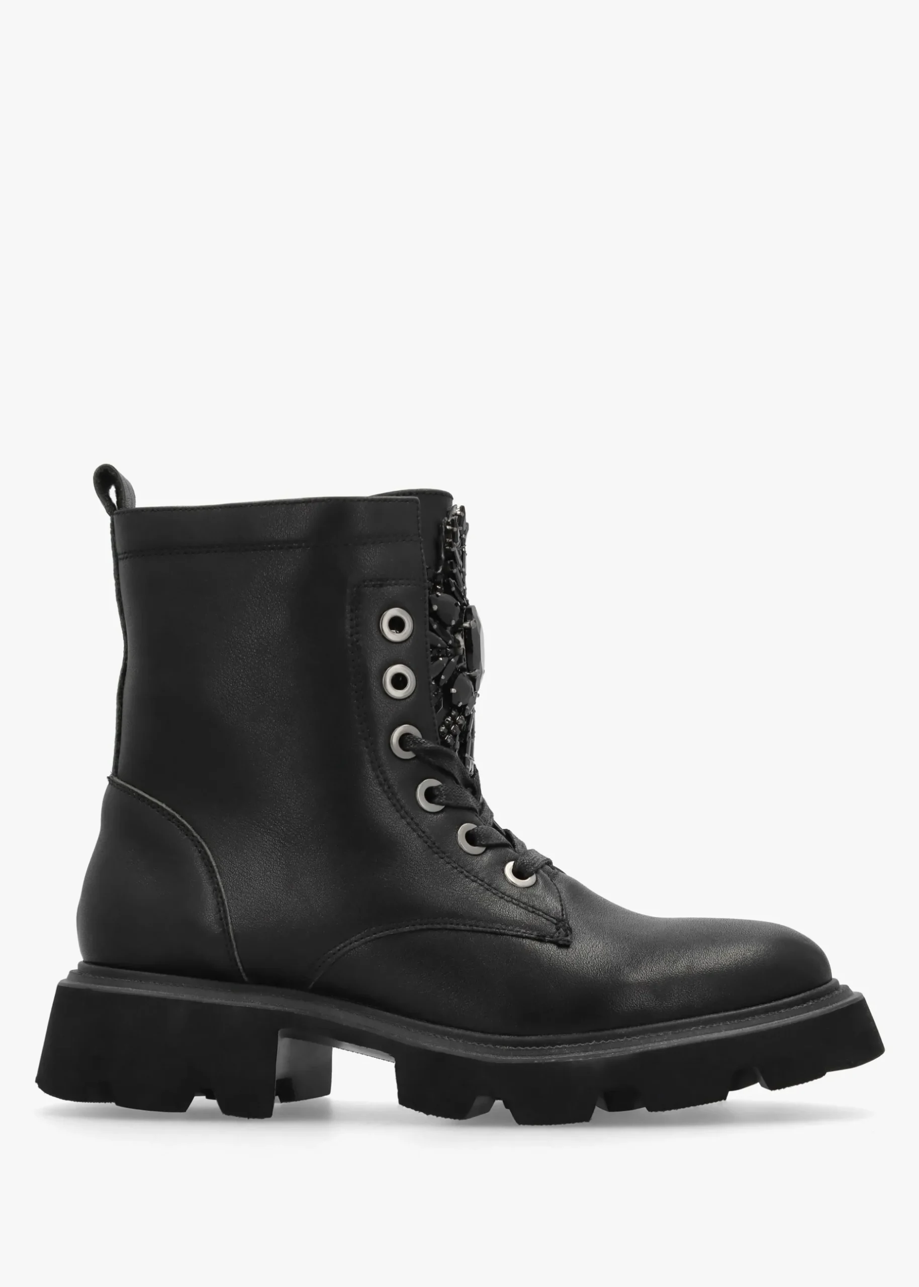 Add the women’s ‘Amari’ ankle boots from Daniel Footwear to your boot collection. This New Season collection if crafted from premium leather with textile lining and a chunky tracked rubber sole. Zip fastening to the inner leg creates an easy wear and the lace up upper ensures the perfect fit. Statement jewel embellishment adds detail to the tongue. Signature Daniel branding is seen to the footbed.
