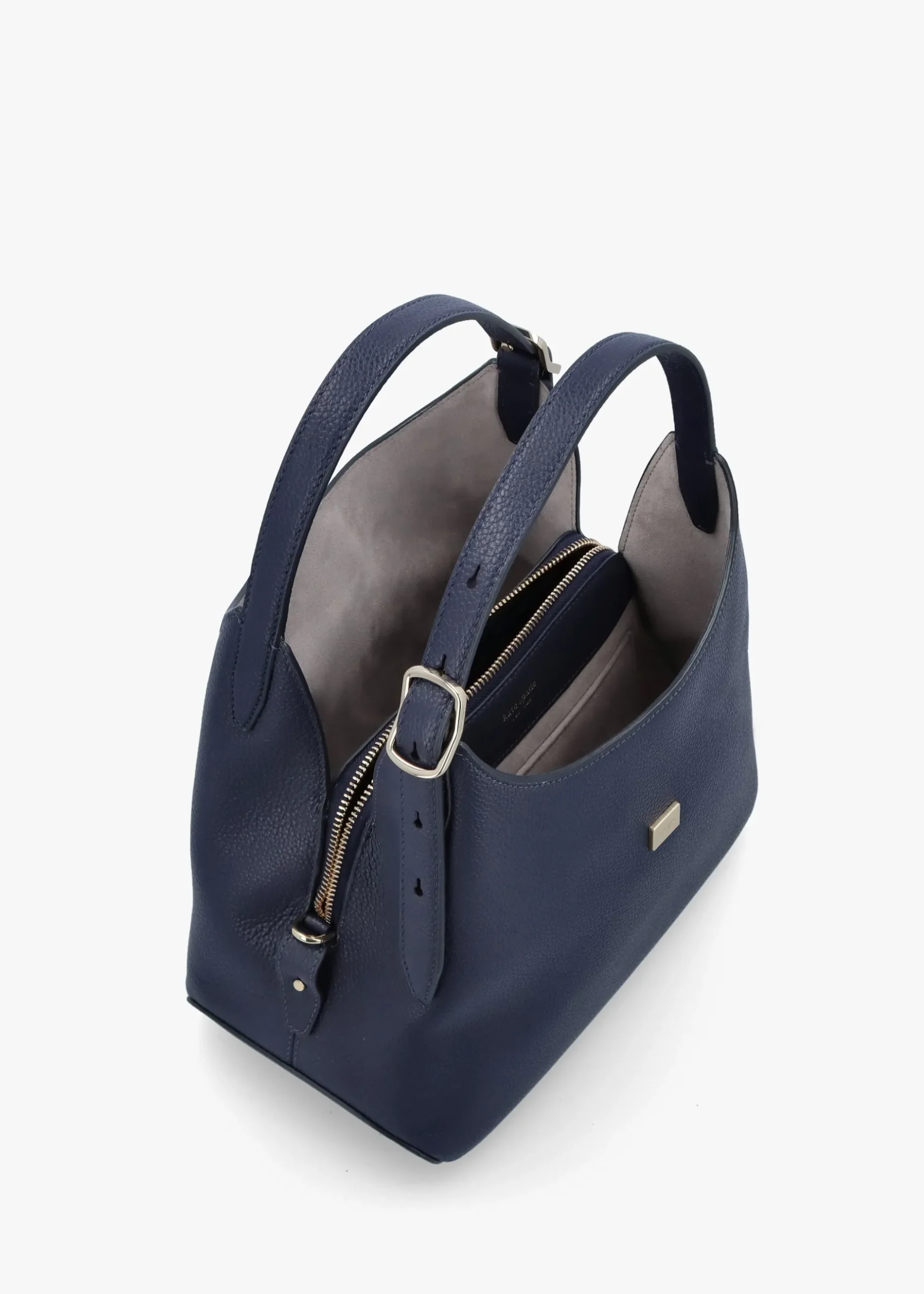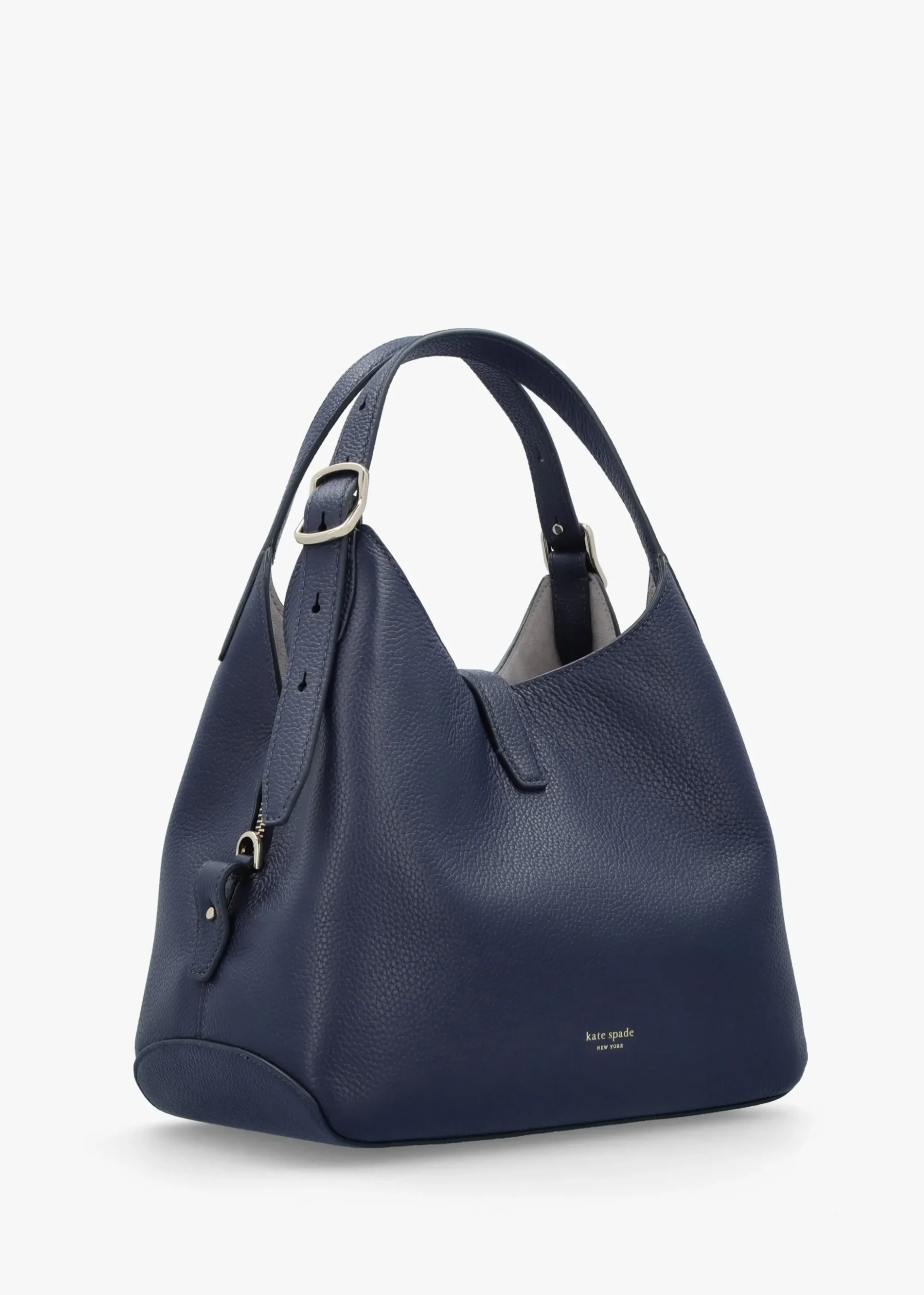 The ultimate everyday carry all style, the ‘Deco’ cross-body tote bag from Kate Spade. Crafted from premium pebbled leather with faille lining, gold tone hardware, and PU trim. Art Deco inspired K hardware logo magnetic snap top strap fastening reveals multiple handy compartments. Carry by the adjustable top handles or the detachable cross-body strap. Signature Kate Spade branding is seen throughout.