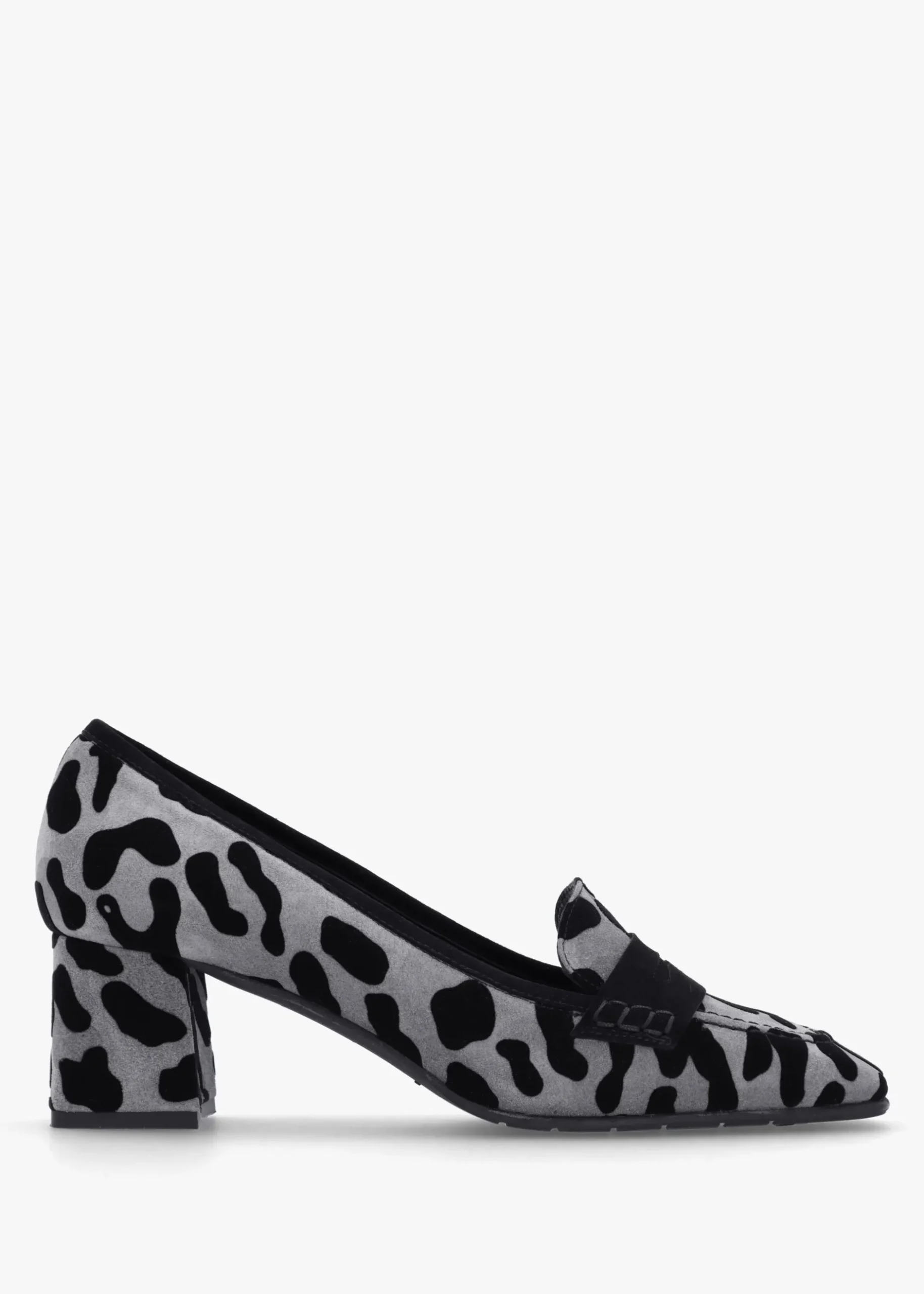 Add these block heel statement loafers from Luca Grossi to your New Season wardrobe. Crafted from a premium suede upper in a raised leopard print design with luxurious leather lining and a rubber sole. An easy to wear slip on style. The square toe and mid-block heel make up the silhouette. Signature Luca Grossi branding is seen to the footbed.
