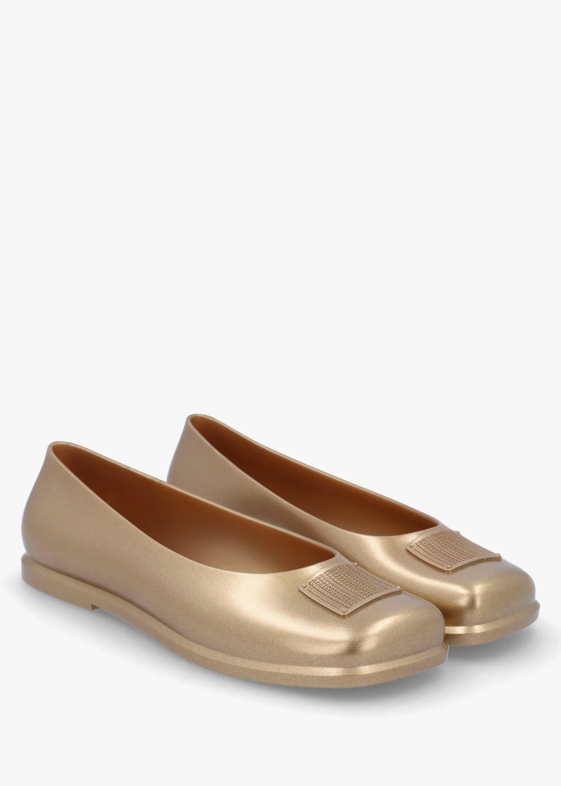 A new collaboration by Marc Jacobs x Melissa this Season – the ‘Ruby’ ballet pumps. Classic ballet pump style crafted from signature sweet scented Melissa Melflex plastic that’s 100% recyclable. Seen here in gold beige, these stylish pumps feature a cushioned logo footbed. Statement Marc Jacobs logo plaque adds detail to the square toe and classic Melissa ‘M’ features to the side of the pumps. A must have collaborative effort by two key designers that is both sustainable and fashionable, the perfect addition to your New Season wardrobe.
