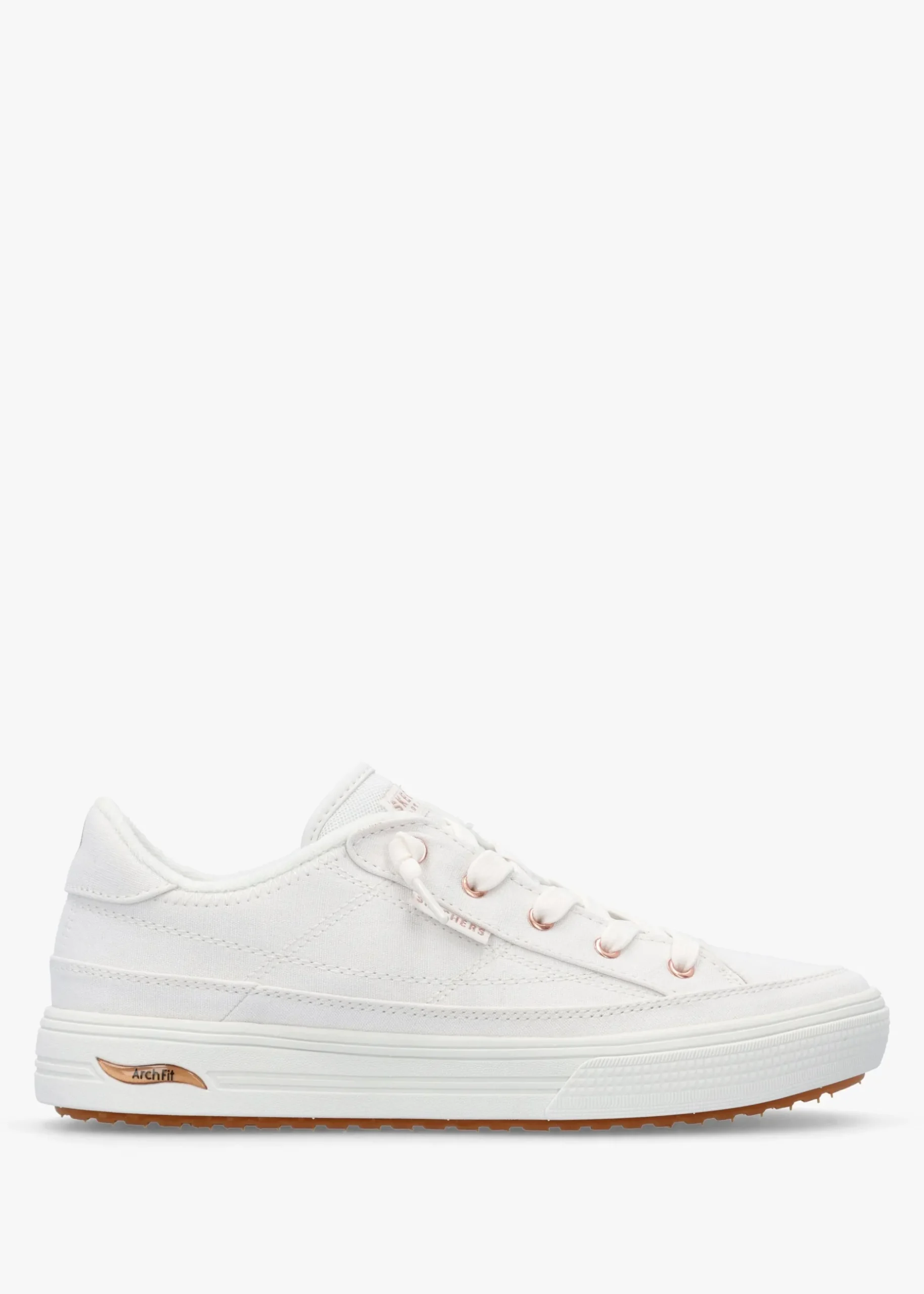 Add the women’s ‘Vegan Arch Fit Meet Ya There’ trainers from Skechers® to your off-duty wardrobe. This New Season style is crafted from a premium canvas upper with lightweight cushioned midsole, Arch Fit® removable insole and a flexible traction sole. An easy to wear slip on style featuring No Tie Fit™ laces. Signature Skechers® branding is seen throughout.