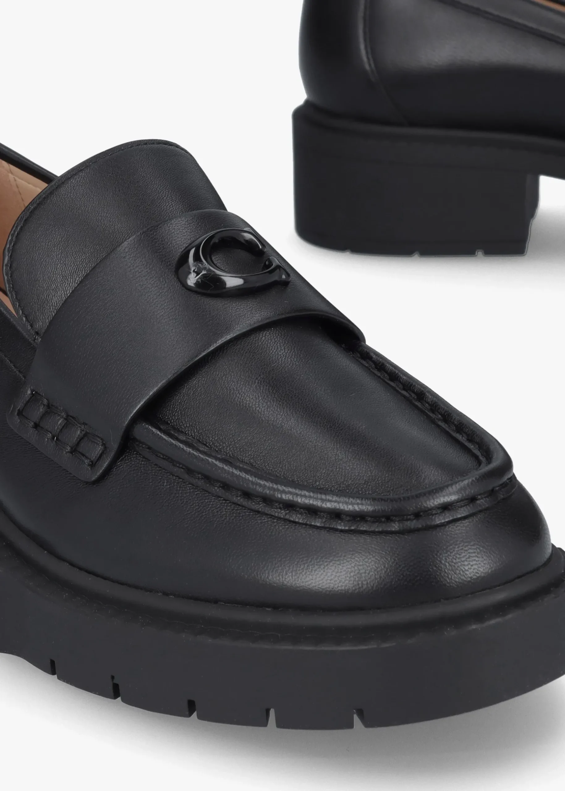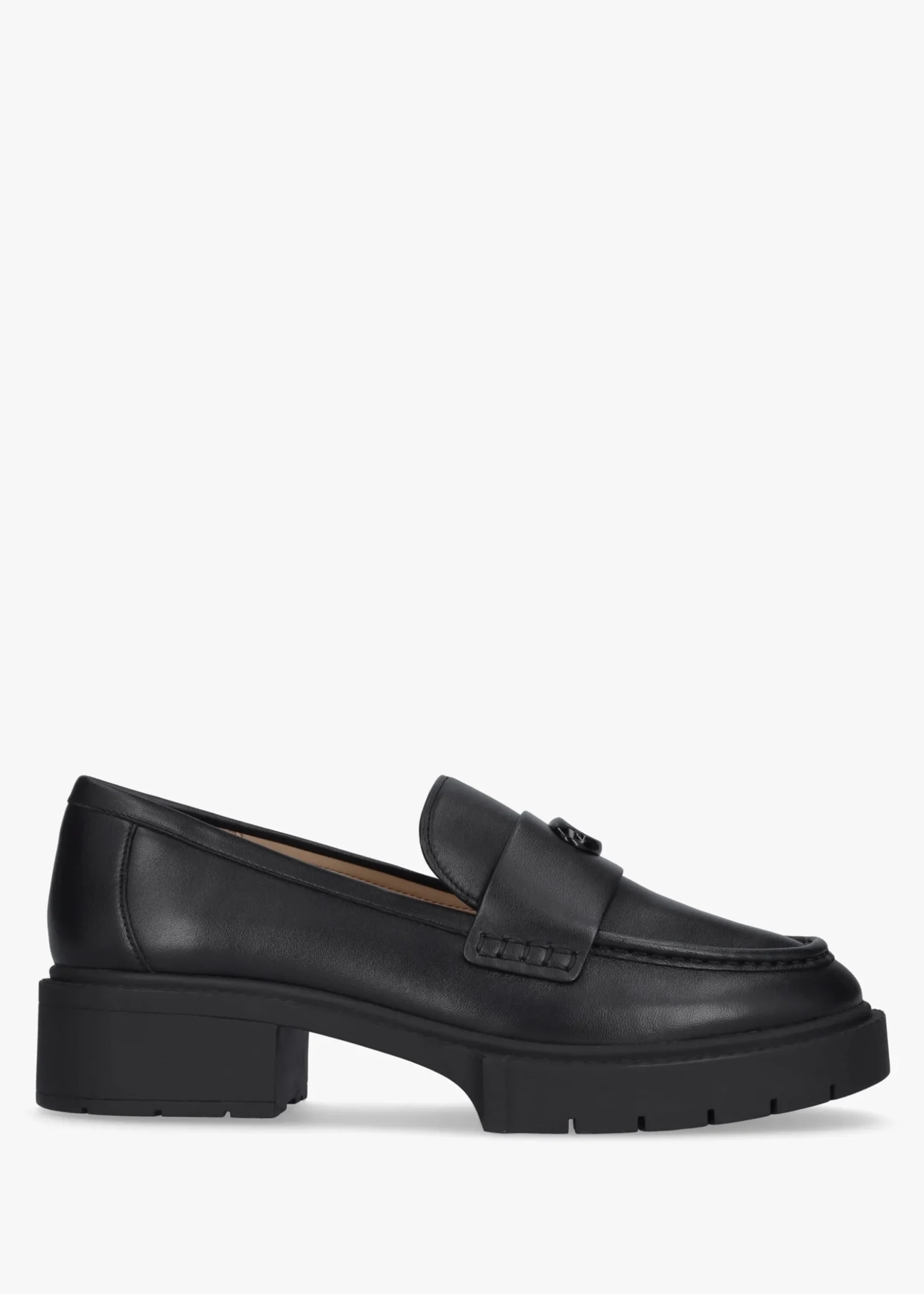 The bestselling ‘Leah’ loafers from COACH are new to Daniel Footwear this Season. This everyday style is crafted from premium leather with leather foot-bed, lining and a chunky rubber sole. The classic round toe and mid heel make up the silhouette. An easy to wear slip on style. Tonal top stitching, raised seaming and ‘C’ logo motif add detail to the upper. Signature COACH branding is seen to the foot-bed and sole.