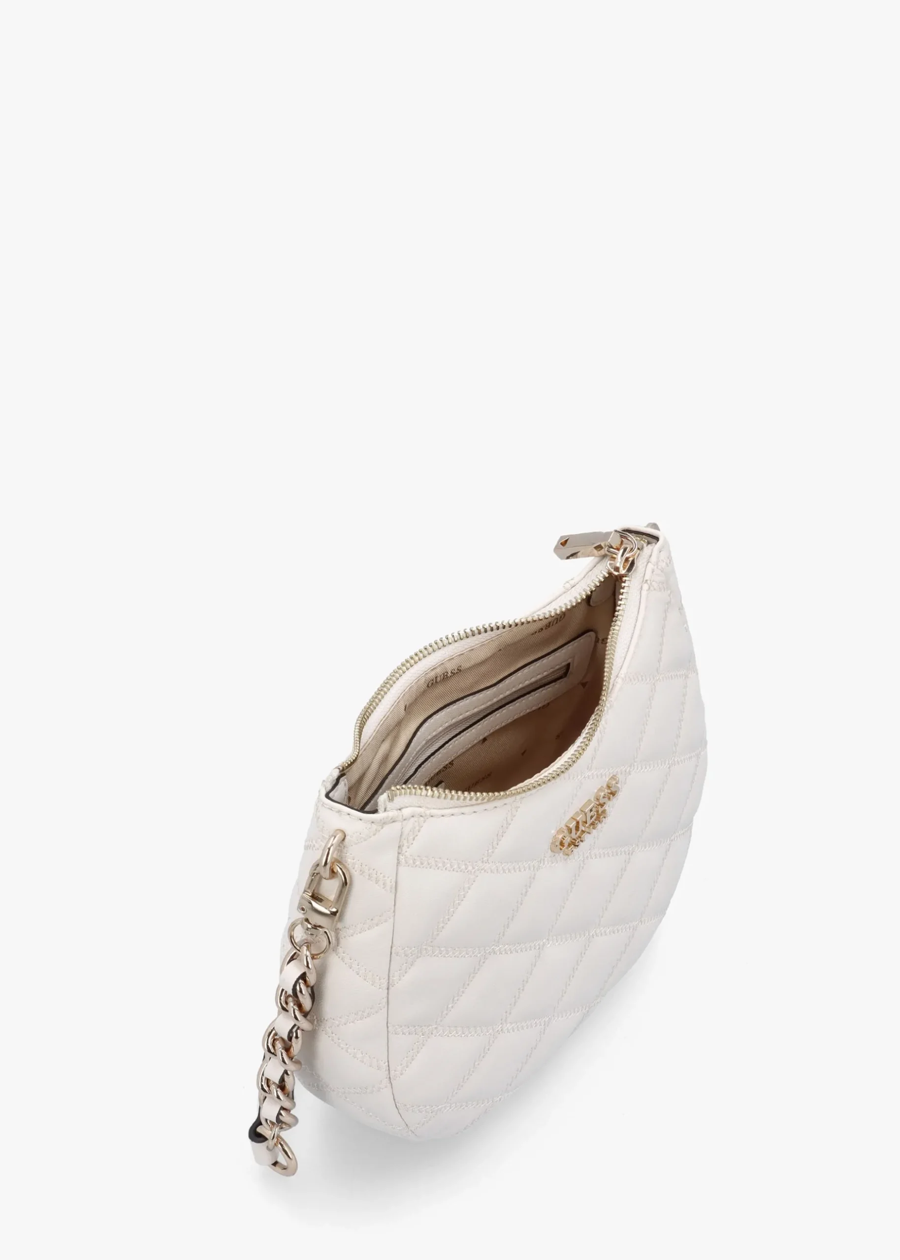 New from GUESS this Season the ‘Tamsin’ shoulder bag. A versatile day to night style crafted from premium PU in a classic quilted design with logo lining and polished gold tone accents. The secure top zip fastening reveals the single main compartment with handy inner zip and slot pockets; exterior zipper pocket also features. Carry by the shoulder strap. Signature GUESS branding adds detail throughout.