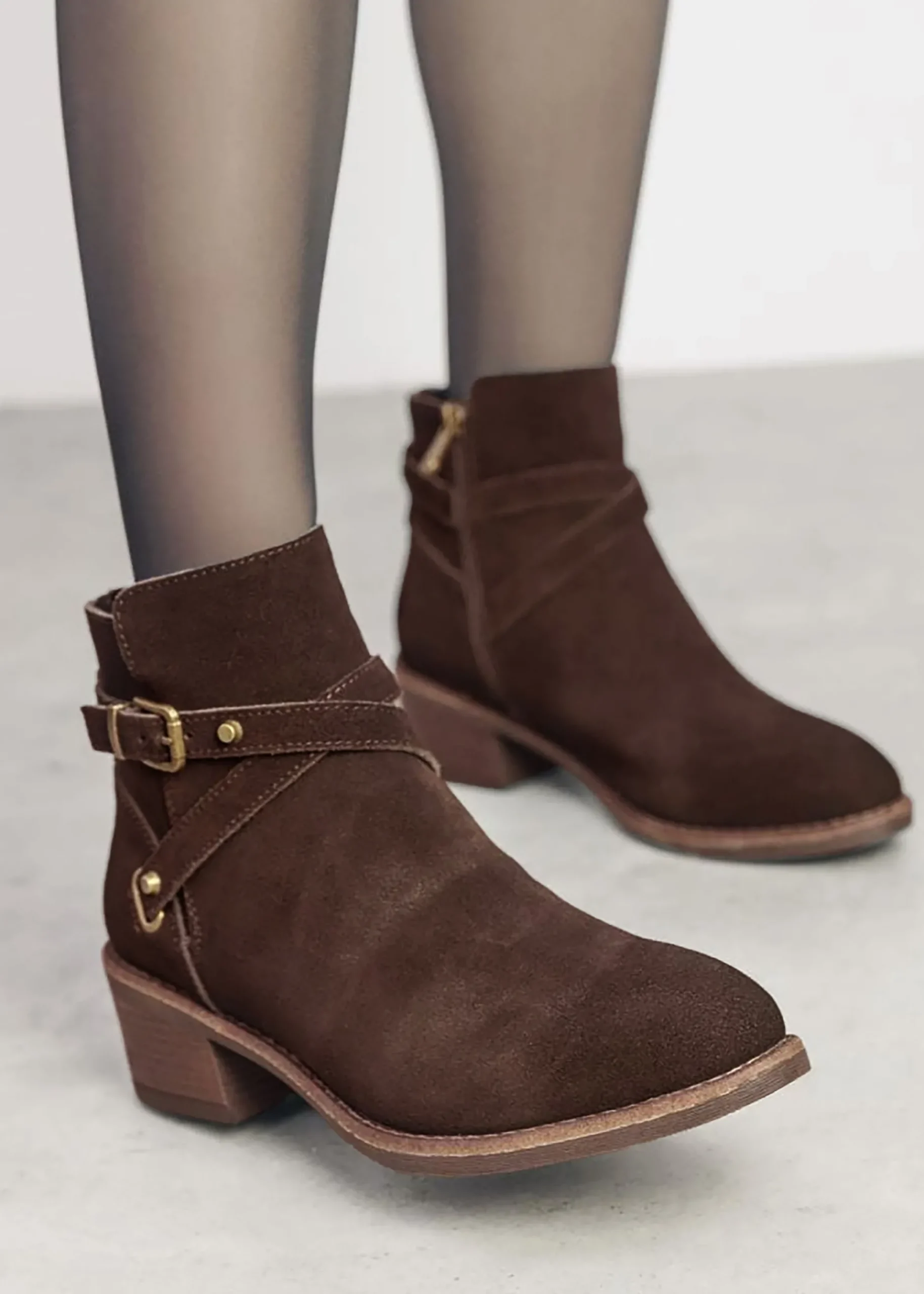 The ‘Orlena’ ankle boots are part of the New Season collection from Moda In Pelle. This everyday style is crafted from a premium suede upper with cozy fleece lining and a rubber sole. The Zip fastening to the inner leg creates an easy wear. Buckle fastening cross straps add detail to the ankle as well as logo rivet. Signature Moda In Pelle branding is seen to the footbed.