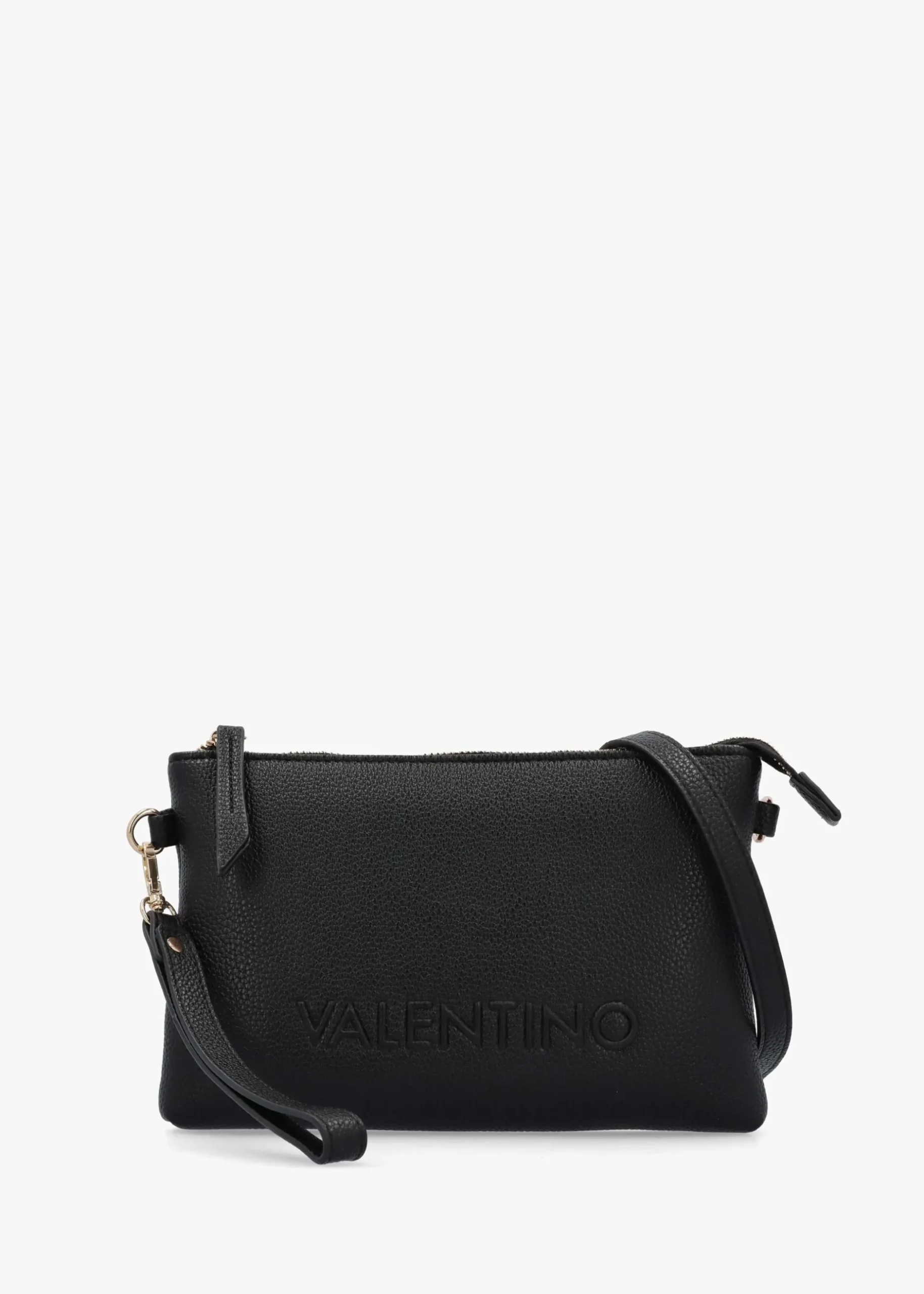 The ‘Rised’ pochette bag from Valentino is a simple and understated accessory. This versatile design is crafted from premium pebbled PU made from part recycled materials with polished gold tone accents. The secure top zip fastening reveals the single main compartment as well as featuring handy inner zip and slot pockets. Carry by the detachable wristlet strap or the removable cross-body strap for handsfree styling. Tonal raised logo adds subtle detail. Signature Valentino branding is seen throughout.