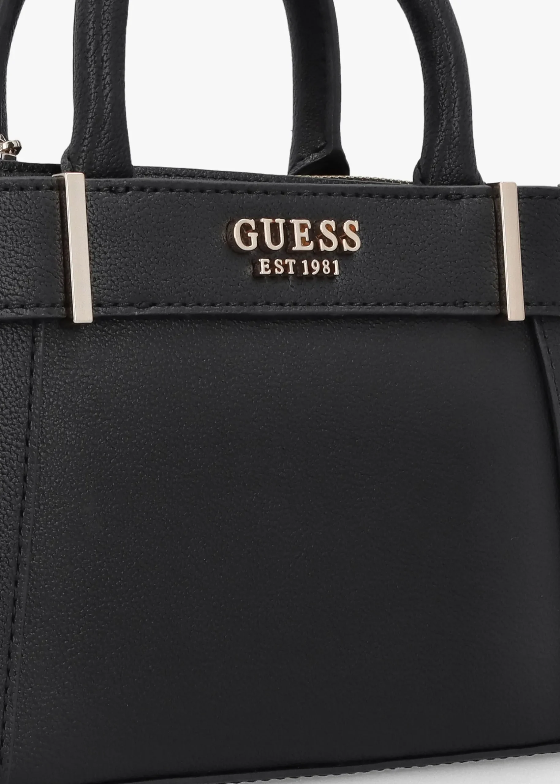 The ‘Anadela Mini’ satchel bag from GUESS is a versatile style that will take you from day to dark with ease. This New Season satchel is crafted from premium textured PU with polished gold tone accents. The secure top zip fastening reveals logo lining, dual compartments as well as handy inner zip and card slot pockets. Carry by the grab handles or the detachable crossbody strap. Signature GUESS branding is seen throughout.