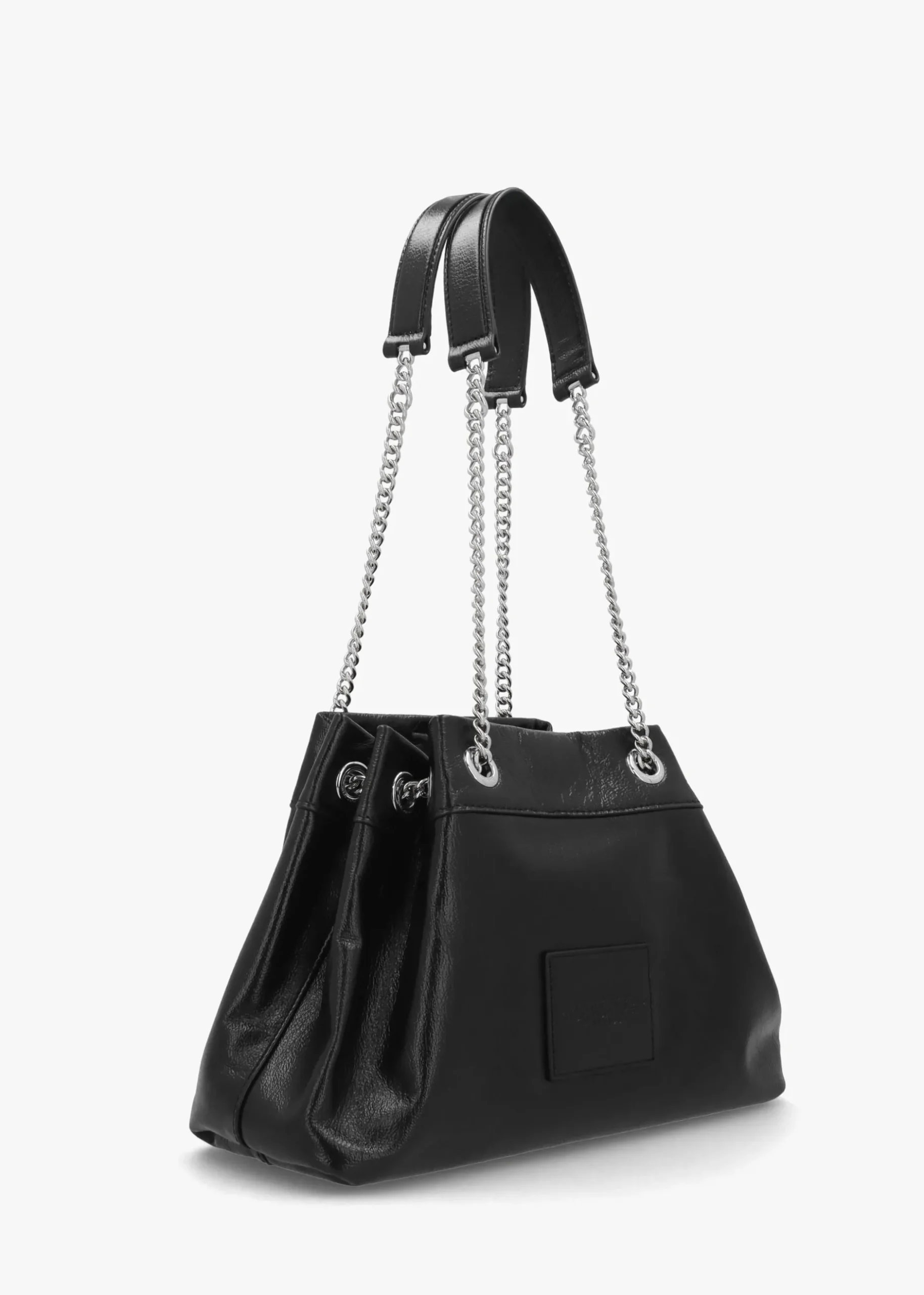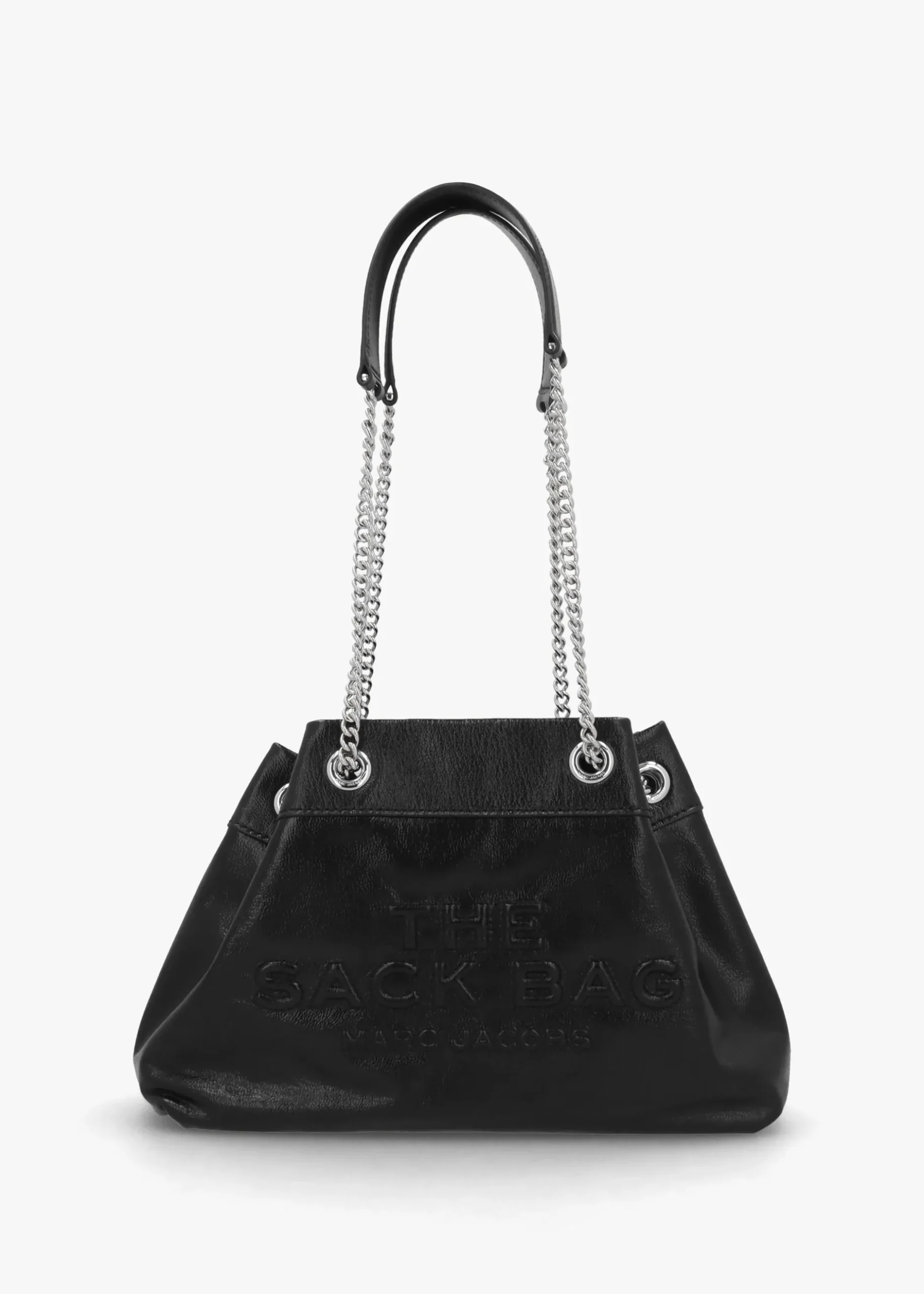 A reinvented silhouette of the iconic Marc Jacobs small ‘Sack Bag’. Crafted from premium patent leather with faille lining and polished silver tone hardware. The secure magnetic snap fastening reveals the spacious single main compartment with handy inner zip and card slot pocket. Carry by the pull through leather and chain strap on the shoulder or across the body. This New Season bag features fresh detailing to this updated must have carryall style. Signature Marc Jacobs branding is seen throughout.