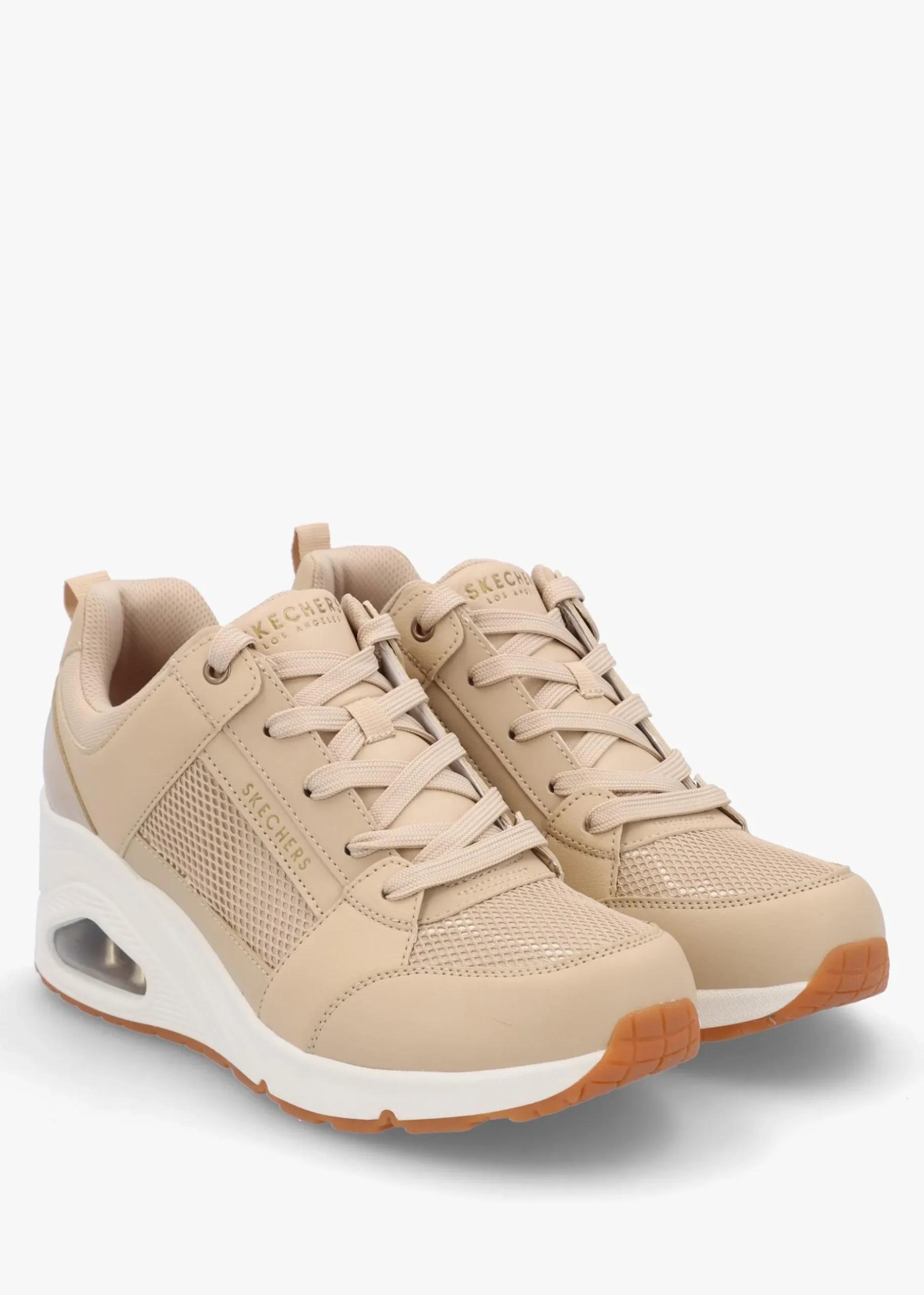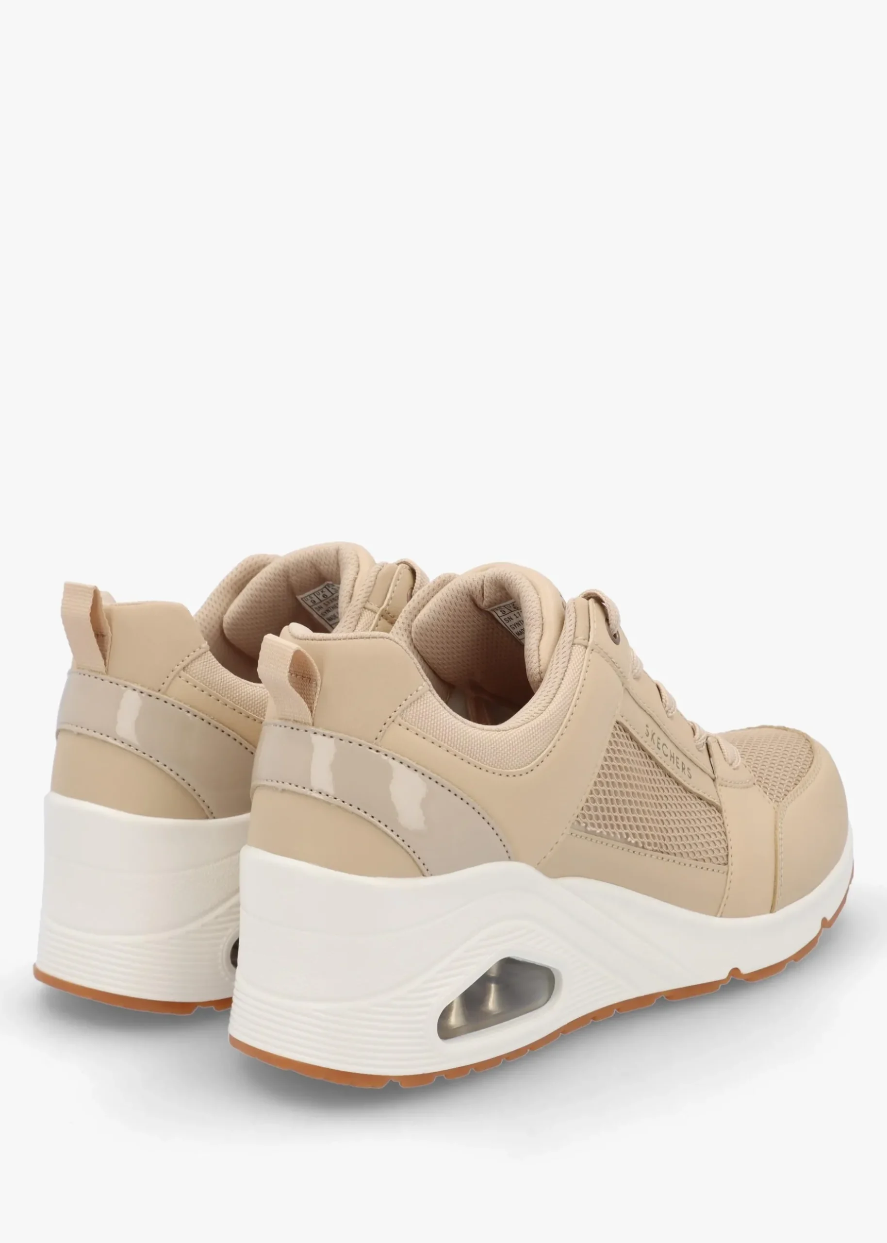 The women’s ‘Uno Everything Nice’ trainers are part of the Skechers® Street™ collection. This fashion sporty style is crafted from premium synthetic duraleather and mesh upper with patent heel trim, classic laces, a Skechers Air-Cooled Memory Foam® insole, Skech-Air® visible airbag platform wedge midsole, Signature Skechers® branding is seen throughout.